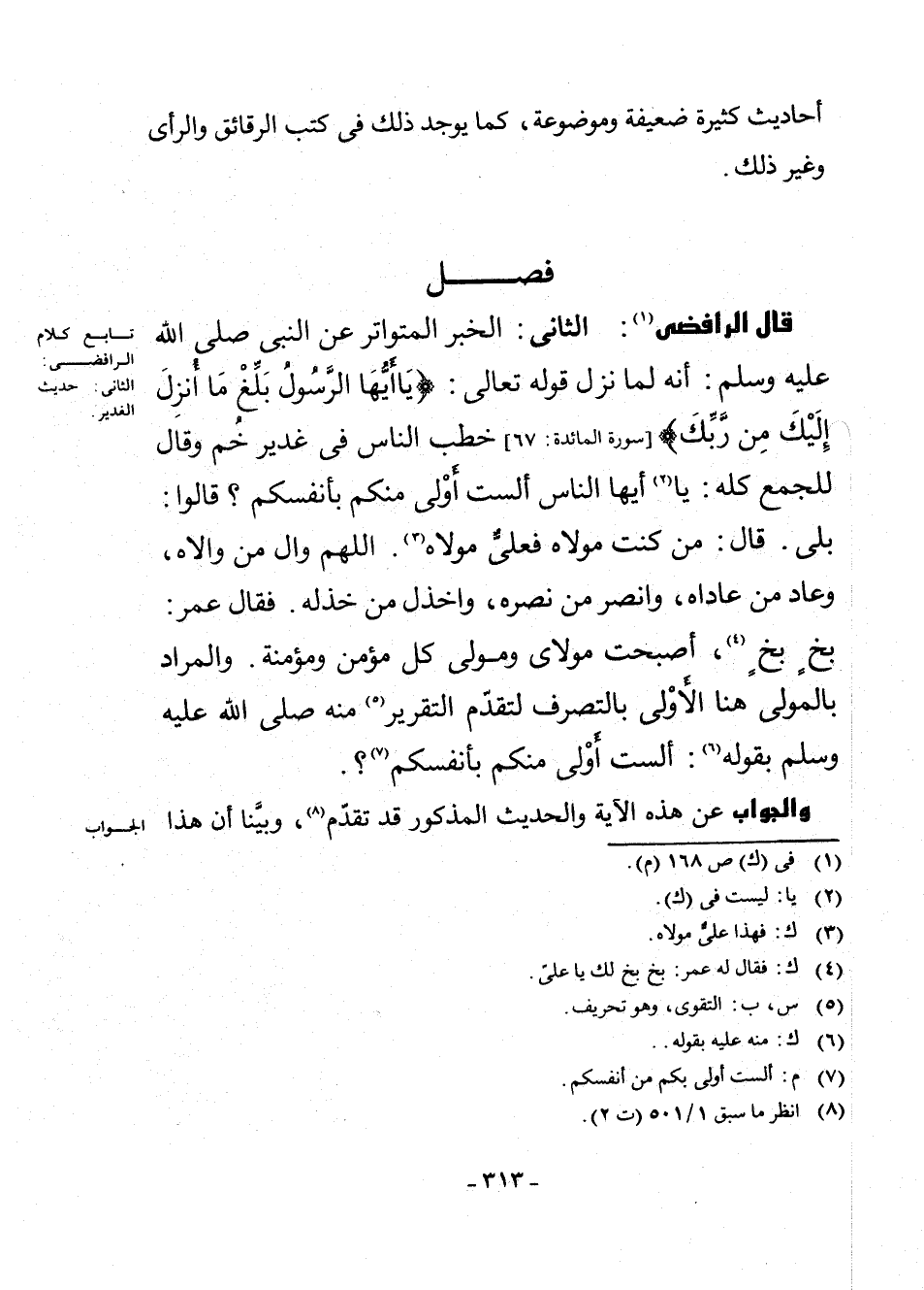 قَالَ الرَّافِضِيُّ: (¬1) : الثَّانِي الْخَبَرُ الْمُتَوَاتِرُ عَنِ النَّبِيِّ صَلَّى اللَّهُ عَلَيْهِ وَسَلَّمَ: أَنَّهُ لَمَّا نَزَلَ قَوْلُهُ تَعَالَى: {يَاأَيُّهَا الرَّسُولُ بَلِّغْ مَا أُنْزِلَ إِلَيْكَ مِنْ رَبِّكَ} (سُورَةُ الْمَائِدَةِ: 67) «خَطَبَ النَّاسَ فِي غَدِيرِ خُمٍّ، وَقَالَ لِلْجَمْعِ كُلِّهِ: يَا (¬2) أَيُّهَا النَّاسُ أَلَسْتُ أَوْلَى مِنْكُمْ بِأَنْفُسِكُمْ؟ قَالُوا: بَلَى، قَالَ: مَنْ كُنْتُ مَوْلَاهُ فَعَلِيٌّ مَوْلَاهُ (¬3) ، اللَّهُمَّ وَالِ مَنْ وَالَاهُ، وَعَادِ مَنْ عَادَاهُ، وَانْصُرْ مَنْ نَصَرَهُ، وَاخْذُلْ مَنْ خَذَلَهُ» ، فَقَالَ عُمَرُ: بَخٍ بَخٍ (¬4) ، أَصْبَحْتَ مَوْلَايَ وَمَوْلَى كُلِّ مُؤْمِنٍ وَمُؤْمِنَةٍ، وَالْمُرَادُ بِالْمَوْلَى هُنَا الْأَوْلَى بِالتَّصَرُّفِ لِتَقَدُّمِ التَّقْرِيرِ (¬5) مِنْهُ صَلَّى اللَّهُ عَلَيْهِ وَسَلَّمَ بِقَوْلِهِ (¬6) : أَلَسْتُ أَوْلَى مِنْكُمْ بِأَنْفُسِكُمْ (¬7) ؟