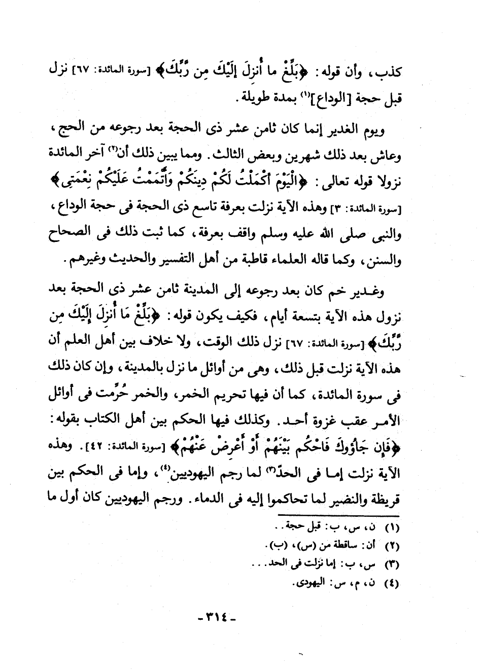 وَغَدِيرُ خُمٍّ كَانَ بَعْدَ رُجُوعِهِ إِلَى الْمَدِينَةِ ثَامِنَ عَشَرَ ذِي الْحَجَّةِ بَعْدَ نُزُولِ هَذِهِ الْآيَةِ بِتِسْعَةِ أَيَّامٍ، فَكَيْفَ يَكُونُ قَوْلُهُ: {بَلِّغْ مَا أُنْزِلَ إِلَيْكَ مِنْ رَبِّكَ} (سُورَةُ الْمَائِدَةِ: 67) نَزَلَ ذَلِكَ الْوَقْتَ، وَلَا خِلَافَ بَيْنَ أَهْلِ الْعِلْمِ أَنَّ هَذِهِ الْآيَةَ نَزَلَتْ قَبْلَ ذَلِكَ، وَهِيَ مِنْ أَوَائِلِ مَا نَزَلَ بِالْمَدِينَةِ، وَإِنْ كَانَ ذَلِكَ فِي سُورَةِ الْمَائِدَةِ كَمَا أَنَّ فِيهَا تَحْرِيمَ الْخَمْرِ، وَالْخَمْرُ حُرِّمَتْ فِي أَوَائِلِ الْأَمْرِ عَقِبَ غَزْوَةِ أُحُدٍ، وَكَذَلِكَ فِيهَا الْحُكْمُ بَيْنَ أَهْلِ الْكِتَابِ بِقَوْلِهِ: {فَإِنْ جَاءُوكَ فَاحْكُمْ بَيْنَهُمْ أَوْ أَعْرِضْ عَنْهُمْ} (سُورَةُ الْمَائِدَةِ: 42) ، وَهَذِهِ الْآيَةُ نَزَلَتْ إِمَّا فِي الْحَدِّ (¬3) لَمَّا رَجَمَ الْيَهُودِيَّيْنِ (¬4) ، وَإِمَّا فِي الْحُكْمِ بَيْنَ قُرَيْظَةَ وَالنَّضِيرِ لَمَّا تَحَاكَمُوا إِلَيْهِ فِي الدِّمَاءِ، وَرَجْمُ الْيَهُودِيَّيْنِ كَانَ أَوَّلَ مَا