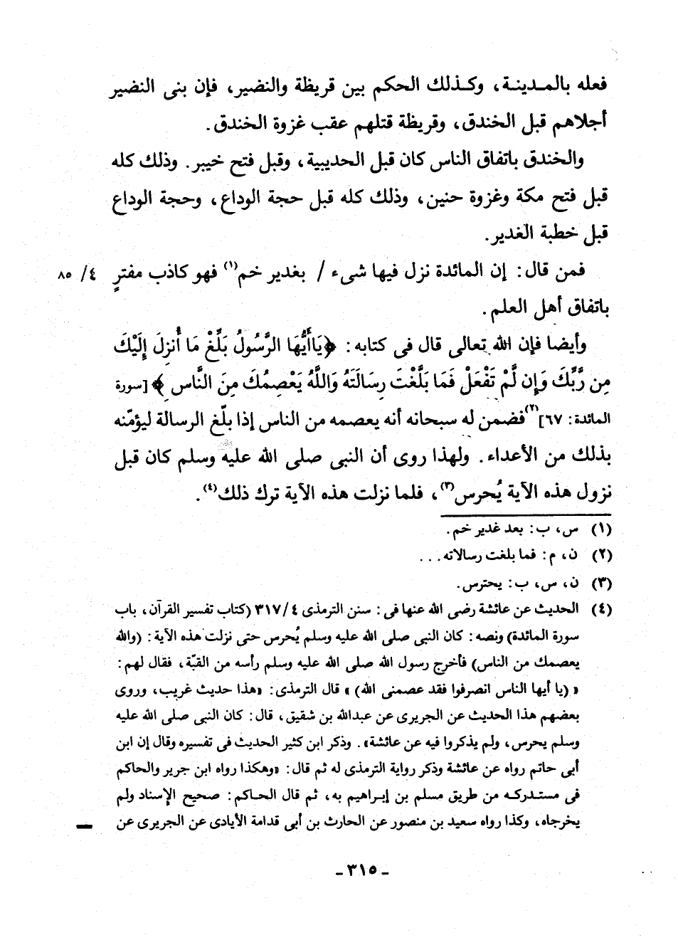(¬4) الْحَدِيثُ عَنْ عَائِشَةَ رَضِيَ اللَّهُ عَنْهَا فِي سُنَنِ التِّرْمِذِيِّ 4/317 (كِتَابُ تَفْسِيرِ الْقُرْآنِ، بَابُ سُورَةِ الْمَائِدَةِ) ، وَنَصُّهُ: " كَانَ النَّبِيُّ صَلَّى اللَّهُ عَلَيْهِ وَسَلَّمَ يُحْرَسُ حَتَّى نَزَلَتْ هَذِهِ الْآيَةُ، وَاللَّهُ يَعْصِمُكَ مِنَ النَّاسِ فَأَخْرَجَ رَسُولُ اللَّهِ صَلَّى اللَّهُ عَلَيْهِ وَسَلَّمَ رَأْسَهُ مِنَ الْقُبَّةِ فَقَالَ لَهُمْ: ((يَا أَيُّهَا النَّاسُ انْصَرِفُوا فَقَدْ عَصَمَنِي اللَّهُ)) قَالَ التِّرْمِذِيُّ: " هَذَا حَدِيثٌ غَرِيبٌ "، وَرَوَى بَعْضُهُمْ هَذَا الْحَدِيثَ عَنِ الْجَرِيرِيِّ عَنْ عَبْدِ اللَّهِ بْنِ شَقِيقٍ، قَالَ: كَانَ النَّبِيُّ صَلَّى اللَّهُ عَلَيْهِ وَسَلَّمَ يُحْرَسُ، وَلَمْ يَذْكُرُوا فِيهِ عَنْ عَائِشَةَ "، وَذَكَرَ ابْنُ كَثِيرٍ الْحَدِيثَ فِي تَفْسِيرِهِ وَقَالَ ابْنُ أَبِي حَاتِمٍ رَوَاهُ عَنْ عَائِشَةَ وَذَكَرَ رِوَايَةَ التِّرْمِذِيِّ لَهُ ثُمَّ قَالَ: " وَهَكَذَا رَوَاهُ ابْنُ جَرِيرٍ وَالْحَاكِمُ فِي مُسْتَدْرَكِهِ مِنْ طَرِيقِ مُسْلِمِ بْنِ إِبْرَاهِيمَ بِهِ، ثُمَّ قَالَ الْحَاكِمُ: صَحِيحُ الْإِسْنَادِ وَلَمْ يُخْرِجَاهُ، وَكَذَا رَوَاهُ سَعِيدُ بْنُ مَنْصُورٍ عَنِ الْحَارِثِ بْنِ أَبِي الْحَارِثِ بْنِ أَبِي قُدَامَةَ الْإِيَادِيِّ عَنِ الْجَرِيرِيِّ عَنْ عَبْدِ اللَّهِ بْنِ شَقِيقٍ عَنْ عَائِشَةَ بِهِ "، وَقَالَ الشَّيْخُ أَحْمَد شَاكِر رَحِمَهُ اللَّهُ فِي " عُمْدَةِ التَّفْسِيرِ عَنِ ابْنِ كَثِيرٍ " 4/193 " إِسْنَادُهُ صَحِيحٌ وَهُوَ فِي التِّرْمِذِيِّ 4: 96 وَالطَّبَرِيِّ 76: 122 وَالْحَاكِمِ 2: 313 وَوَافَقَهُ الذَّهَبِيُّ عَلَى تَصْحِيحِهِ، وَرَوَاهُ بَعْضُهُمْ مُرْسَلًا، عِنْدَ الطَّبَرِيِّ وَغَيْرِهِ، وَأَشَارَ التِّرْمِذِيُّ إِلَى ذَلِكَ، وَمَا هَذِهِ بِعِلَّةٍ تَقْدَحُ فِي صِحَّةِ الْمَوْصُولِ ".