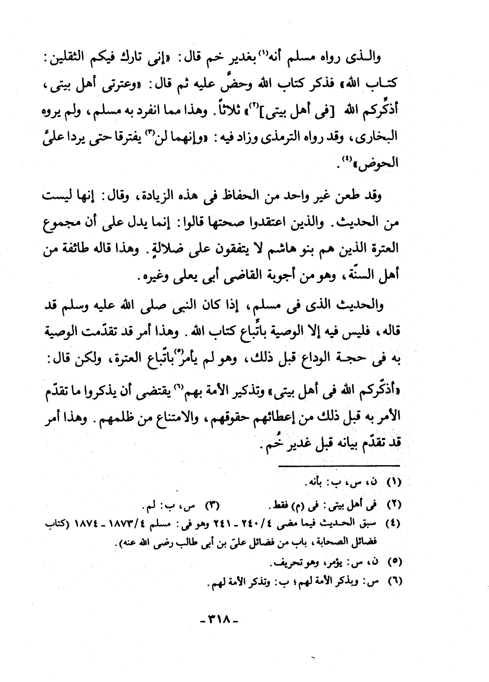 وَالْحَدِيثُ الَّذِي فِي مُسْلِمٍ إِذَا كَانَ النَّبِيُّ صَلَّى اللَّهُ عَلَيْهِ وَسَلَّمَ قَدْ قَالَهُ، فَلَيْسَ فِيهِ إِلَّا الْوَصِيَّةُ بِاتِّبَاعِ كِتَابِ اللَّهِ، وَهَذَا أَمْرٌ قَدْ تَقَدَّمَتِ الْوَصِيَّةُ بِهِ فِي حَجَّةِ الْوَدَاعِ قَبْلَ ذَلِكَ، وَهُوَ لَمْ يَأْمُرْ (¬5) بِاتِّبَاعِ الْعِتْرَةِ، وَلَكِنْ قَالَ: " «أُذَكِّرُكُمُ اللَّهَ فِي أَهْلِ بَيْتِي» "، وَتَذْكِيرُ الْأُمَّةِ بِهِمْ (¬6) يَقْتَضِي أَنْ يَذْكُرُوا مَا تَقَدَّمَ الْأَمْرُ بِهِ قَبْلَ ذَلِكَ مِنْ إِعْطَائِهِمْ حُقُوقَهُمْ، وَالِامْتِنَاعِ مِنْ ظُلْمِهِمْ، وَهَذَا أَمْرٌ قَدْ تَقَدَّمَ بَيَانُهُ قَبْلَ غَدِيرِ خُمٍّ.