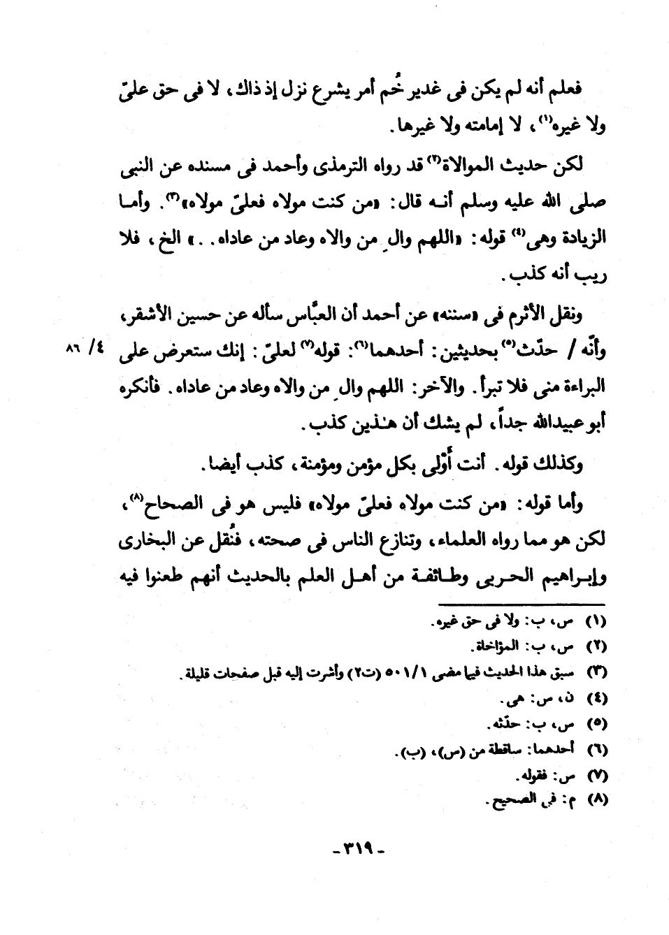 لَكِنَّ حَدِيثَ الْمُوَالَاةِ (¬2) قَدْ رَوَاهُ التِّرْمِذِيُّ، وَأَحْمَدُ فِي مُسْنَدِهِ عَنِ النَّبِيِّ صَلَّى اللَّهُ عَلَيْهِ وَسَلَّمَ أَنَّهُ قَالَ: " «مَنْ كُنْتُ مَوْلَاهُ فَعَلِيٌّ مَوْلَاهُ» " (¬3) ، وَأَمَّا الزِّيَادَةُ وَهِيَ (¬4) قَوْلُهُ: " «اللَّهُمَّ وَالِ مَنْ وَالَاهُ، وَعَادِ مَنْ عَادَاهُ» . . . " إِلَخْ فَلَا رَيْبَ أَنَّهُ كَذِبٌ.