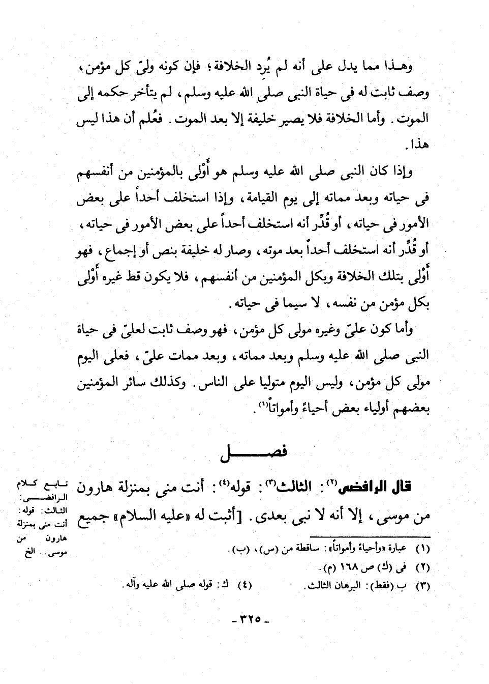 وَإِذَا كَانَ النَّبِيُّ صَلَّى اللَّهُ عَلَيْهِ وَسَلَّمَ هُوَ أَوْلَى بِالْمُؤْمِنِينَ مِنْ أَنْفُسِهِمْ فِي حَيَاتِهِ وَبَعْدَ مَمَاتِهِ إِلَى يَوْمِ الْقِيَامَةِ، وَإِذَا اسْتَخْلَفَ أَحَدًا عَلَى بَعْضِ الْأُمُورِ فِي حَيَاتِهِ، أَوْ قُدِّرَ أَنَّهُ اسْتَخْلَفَ أَحَدًا عَلَى بَعْضِ الْأُمُورِ فِي حَيَاتِهِ، أَوْ قُدِّرَ أَنَّهُ اسْتَخْلَفَ أَحَدًا بَعْدَ مَوْتِهِ، وَصَارَ لَهُ خَلِيفَةً بِنَصٍّ، أَوْ إِجْمَاعٍ فَهُوَ أَوْلَى بِتِلْكَ الْخِلَافَةِ وَبِكُلِّ الْمُؤْمِنِينَ مِنْ أَنْفُسِهِمْ فَلَا يَكُونُ قَطُّ غَيْرُهُ أَوْلَى بِكُلِّ مُؤْمِنٍ مِنْ نَفْسِهِ، لَا سِيَّمَا فِي حَيَاتِهِ.