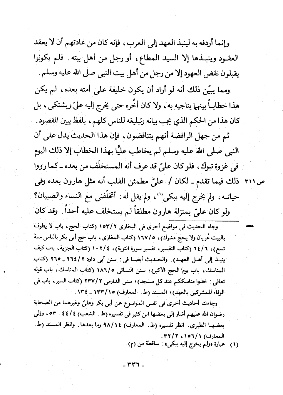 ، ثُمَّ مِنْ جَهْلِ الرَّافِضَةِ أَنَّهُمْ يَتَنَاقَضُونَ، فَإِنَّ هَذَا الْحَدِيثَ يَدُلُّ عَلَى أَنَّ النَّبِيَّ صَلَّى اللَّهُ عَلَيْهِ وَسَلَّمَ لَمْ يُخَاطِبْ عَلِيًّا بِهَذَا الْخِطَابِ إِلَّا ذَلِكَ الْيَوْمَ فِي غَزْوَةِ تَبُوكَ، فَلَوْ كَانَ عَلِيٌّ قَدْ عَرَفَ أَنَّهُ الْمُسْتَخْلَفُ مِنْ بَعْدِهِ - كَمَا رَوَوْا ذَلِكَ فِيمَا تَقَدَّمَ - لَكَانَ عَلِيٌّ مُطْمَئِنَّ الْقَلْبِ أَنَّهُ مِثْلُ هَارُونَ بَعْدَهُ وَفِي حَيَاتِهِ، وَلَمْ يَخْرُجْ إِلَيْهِ يَبْكِي (¬1) ، وَلَمْ يَقُلْ لَهُ: أَتُخَلِّفُنِي مَعَ النِّسَاءِ وَالصِّبْيَانِ؟