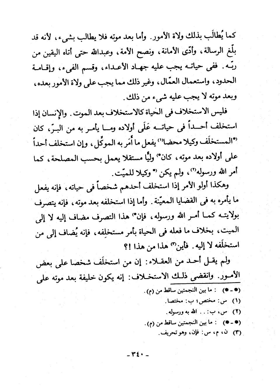 وَلَمْ يَقُلْ أَحَدٌ مِنَ الْعُقَلَاءِ: إِنَّ مَنِ اسْتَخْلَفَ شَخَّصَا عَلَى بَعْضِ الْأُمُورِ، وَانْقَضَى ذَلِكَ الِاسْتِخْلَافُ: إِنَّهُ يَكُونُ خَلِيفَةً بَعْدَ مَوْتِهِ عَلَى