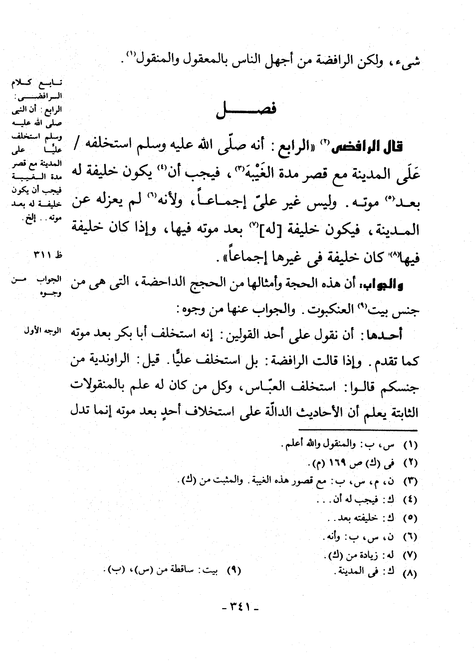 أَحَدُهَا: أَنْ نَقُولَ عَلَى أَحَدِ الْقَوْلَيْنِ: إِنَّهُ اسْتَخْلَفَ أَبَا بَكْرٍ بَعْدَ مَوْتِهِ، كَمَا تَقَدَّمَ، وَإِذَا قَالَتِ الرَّافِضَةُ: بَلِ اسْتَخْلَفَ عَلِيًّا، قِيلَ: الرَّاوِنْدِيَّةُ مِنْ جِنْسِكُمْ قَالُوا: اسْتَخْلَفَ الْعَبَّاسَ، وَكُلُّ مَنْ كَانَ لَهُ عِلْمٌ بِالْمَنْقُولَاتِ الثَّابِتَةِ يَعْلَمُ أَنَّ الْأَحَادِيثَ الدَّالَّةَ عَلَى اسْتِخْلَافِ أَحَدٍ بَعْدَ مَوْتِهِ، إِنَّمَا تَدُلُّ
