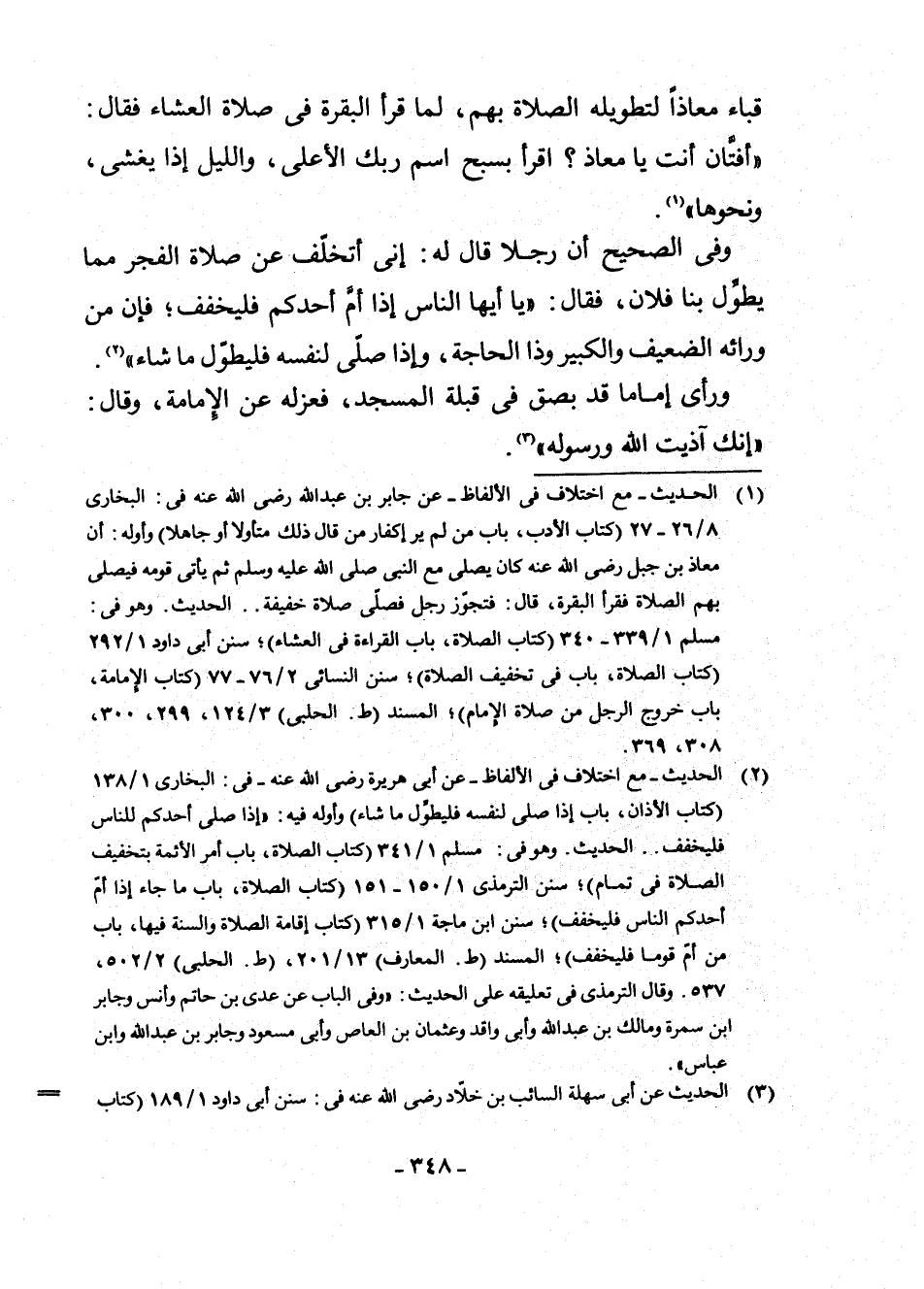 (¬1) الْحَدِيثُ ـ مَعَ اخْتِلَافٍ فِي الْأَلْفَاظِ ـ عَنْ جَابِرِ بْنِ عَبْدِ اللَّهِ رَضِيَ اللَّهُ عَنْهُ فِي: الْبُخَارِيِّ 8/26 ـ 27 (كِتَابُ الْأَدَبِ، بَابُ مَنْ لَمْ يَرَ إِكْفَارَ مَنْ قَالَ ذَلِكَ مُتَأَوِّلًا أَوْ جَاهِلًا) وَأَوَّلَهُ: أَنَّ مُعَاذَ بْنَ جَبَلٍ رَضِيَ اللَّهُ عَنْهُ كَانَ يُصَلِّي مَعَ النَّبِيِّ صَلَّى اللَّهُ عَلَيْهِ وَسَلَّمَ ثُمَّ يَأْتِي قَوْمَهُ فَيُصَلِّي بِهِمُ الصَّلَاةَ فَقَرَأَ الْبَقَرَةَ، قَالَ: فَتَجَوَّزَ رَجُلٌ فَصَلَّى صَلَاةً خَفِيفَةً. . . الْحَدِيثَ. وَهُوَ فِي: مُسْلِمٍ 1/339 ـ 340 (كِتَابُ الصَّلَاةِ، بَابُ الْقِرَاءَةِ فِي الْعَشَاءِ) ; سُنَنِ أَبِي دَاوُدَ 1/292 (كِتَابُ الصَّلَاةِ، بَابُ تَخْفِيفِ الصَّلَاةِ) ; سُنَنِ النَّسَائِيِّ 2/76 ـ 77 (كِتَابُ الْإِمَامَةِ، بَابُ خُرُوجِ الرَّجُلِ مِنْ صَلَاةِ الْإِمَامِ) ، الْمُسْنَدِ (ط. الْحَلَبِيِّ) . 3/124، 229، 300، 308، 369