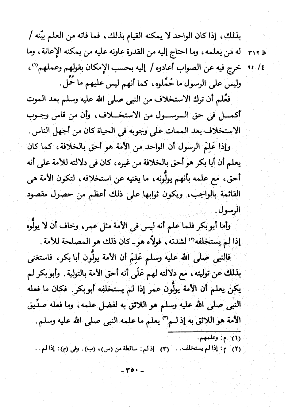 فَعُلِمَ أَنَّ تَرْكَ الِاسْتِخْلَافِ مِنَ النَّبِيِّ صَلَّى اللَّهُ عَلَيْهِ وَسَلَّمَ بَعْدَ الْمَوْتِ أَكْمَلُ فِي حَقِّ الرَّسُولِ مِنَ الِاسْتِخْلَافِ، وَأَنَّ مَنْ قَاسَ وُجُوبَ الِاسْتِخْلَافِ بَعْدَ الْمَمَاتِ عَلَى وُجُوبِهِ فِي الْحَيَاةِ كَانَ مِنْ أَجْهَلِ النَّاسِ.