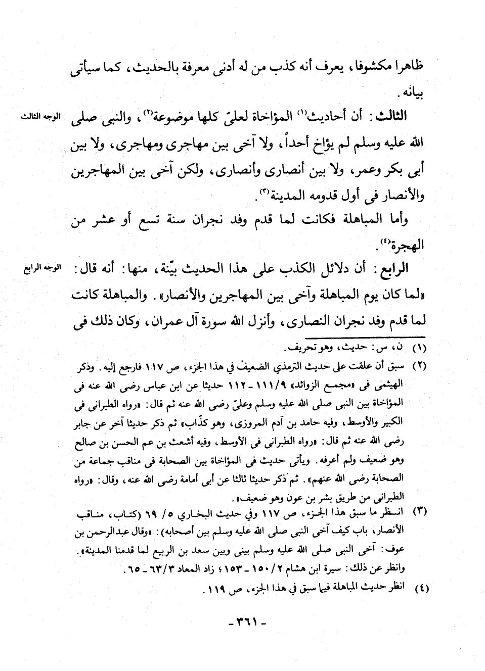 الرَّابِعُ: أَنَّ دَلَائِلَ الْكَذِبِ عَلَى هَذَا الْحَدِيثِ بَيِّنَةٌ مِنْهَا: أَنَّهُ قَالَ: " لَمَّا كَانَ يَوْمُ الْمُبَاهَلَةِ وَآخَى بَيْنَ الْمُهَاجِرِينَ وَالْأَنْصَارِ "، وَالْمُبَاهَلَةُ كَانَتْ لَمَّا قَدِمَ وَفْدُ نَجْرَانَ النَّصَارَى، وَأَنْزَلَ اللَّهُ سُورَةَ آلِ عِمْرَانَ، وَكَانَ ذَلِكَ فِي