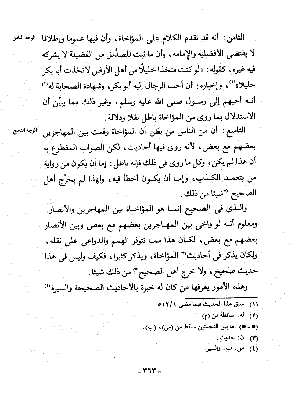 التَّاسِعُ: أَنَّ مِنَ النَّاسِ مَنْ يَظُنُّ أَنَّ الْمُؤَاخَاةَ، وَقَعَتْ بَيْنَ الْمُهَاجِرِينَ بَعْضِهِمْ مَعَ بَعْضٍ ; لِأَنَّهُ رُوِيَ فِيهَا أَحَادِيثُ، لَكِنَّ الصَّوَابَ الْمَقْطُوعَ بِهِ أَنَّ هَذَا لَمْ يَكُنْ، وَكُلُّ مَا رُوِيَ فِي ذَلِكَ فَإِنَّهُ بَاطِلٌ، إِمَّا أَنْ يَكُونَ مِنْ رِوَايَةِ مَنْ يَتَعَمَّدُ الْكَذِبَ، وَإِمَّا أَنْ يَكُونَ أَخْطَأَ فِيهِ، وَلِهَذَا لَمْ يُخَرِّجْ أَهْلُ الصَّحِيحِ * شَيْئًا مِنْ ذَلِكَ.