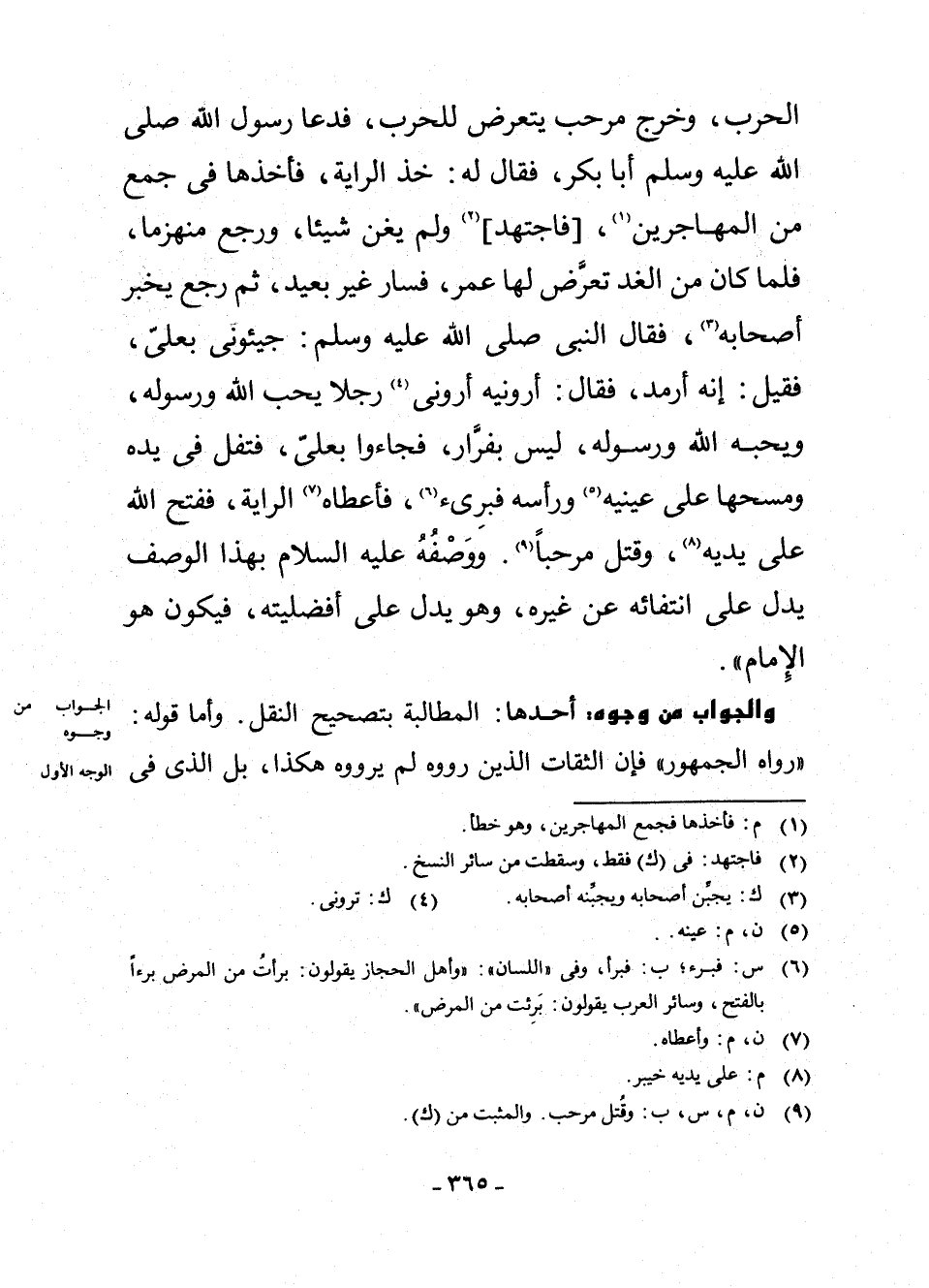 الْحَرْبِ، وَخَرَجَ مُرَحَّبٌ يَتَعَرَّضُ لِلْحَرْبِ فَدَعَا رَسُولُ اللَّهِ صَلَّى اللَّهُ عَلَيْهِ وَسَلَّمَ أَبَا بَكْرٍ، فَقَالَ لَهُ خُذِ الرَّايَةَ فَأَخَذَهَا فِي جَمْعٍ مِنَ الْمُهَاجِرِينَ (¬1) (فَاجْتَهَدَ) (¬2) ، وَلَمْ يُغْنِ شَيْئًا، وَرَجَعَ مُنْهَزِمًا فَلَمَّا كَانَ مِنَ الْغَدِ تَعَرَضَّ لَهَا عُمَرُ فَسَارَ غَيْرَ بَعِيدٍ، ثُمَّ رَجَعَ يُخْبِرُ أَصْحَابَهُ (¬3) ، فَقَالَ النَّبِيُّ صَلَّى اللَّهُ عَلَيْهِ وَسَلَّمَ: جِيئُونِي بِعَلِيٍّ، فَقِيلَ: إِنَّهُ أَرْمَدُ، فَقَالَ: أَرُونِيهِ أَرُونِي (¬4) رَجُلًا يُحِبُّ اللَّهَ وَرَسُولَهُ، وَيُحِبُّهُ اللَّهُ وَرَسُولُهُ لَيْسَ بِفَرَّارٍ، فَجَاءُوا بِعَلِيٍّ فَتَفَلَ فِي يَدِهِ، وَمَسَحَهَا عَلَى عَيْنَيْهِ (¬5) وَرَأْسِهِ فَبَرِئَ (¬6) فَأَعْطَاهُ (¬7) الرَّايَةَ فَفَتَحَ اللَّهُ عَلَى يَدَيْهِ (¬8) ، وَقَتَلَ مُرَحَّبًا» (¬9) ، وَوَصْفُهُ عَلَيْهِ السَّلَامُ بِهَذَا الْوَصْفِ يَدُلُّ عَلَى انْتِفَائِهِ عَنْ غَيْرِهِ، وَهُوَ يَدُلُّ عَلَى أَفْضَلِيَّتِهِ فَيَكُونُ هُوَ الْإِمَامَ.