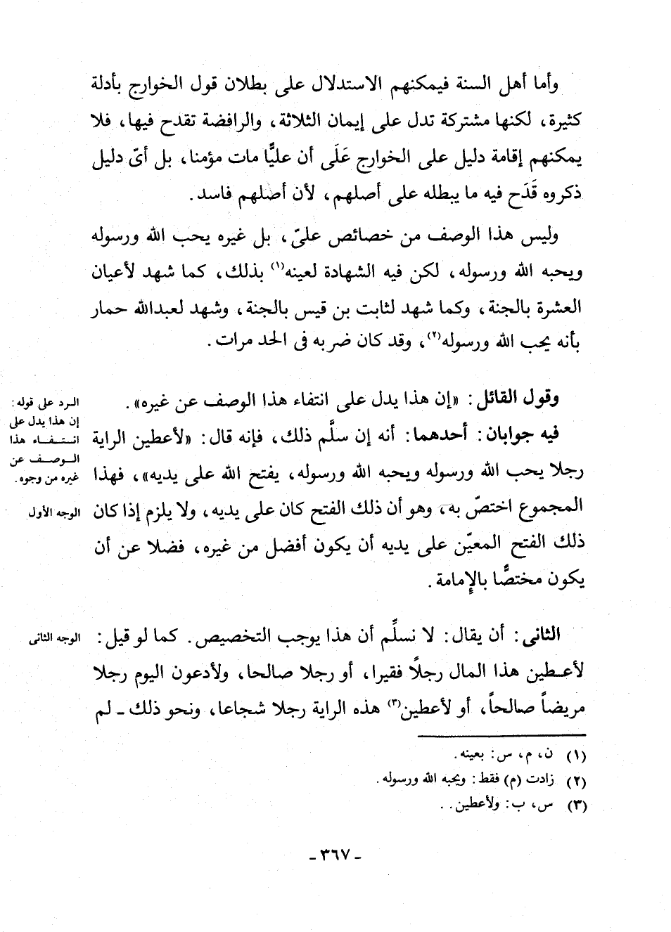 فِيهِ جَوَابَانِ: أَحَدُهُمَا: أَنَّهُ إِنْ سُلِّمَ ذَلِكَ، فَإِنَّهُ قَالَ: " «لَأُعْطِيَنَّ الرَّايَةَ رَجُلًا يُحِبُّ اللَّهَ وَرَسُولَهُ، وَيُحِبُّهُ اللَّهُ وَرَسُولُهُ يَفْتَحُ اللَّهُ عَلَى يَدَيْهِ» ".