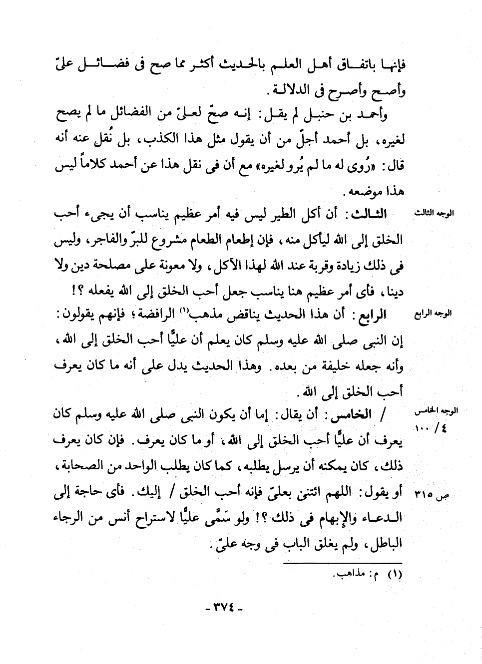 الْخَامِسُ: أَنْ يُقَالَ: إِمَّا أَنْ يَكُونَ النَّبِيُّ صَلَّى اللَّهُ عَلَيْهِ وَسَلَّمَ كَانَ يَعْرِفُ أَنَّ عَلِيًّا أَحَبُّ الْخَلْقِ إِلَى اللَّهِ، أَوْ مَا كَانَ يَعْرِفُ، فَإِنْ كَانَ يَعْرِفُ ذَلِكَ كَانَ يُمْكِنُهُ أَنْ يُرْسِلَ يَطْلُبُهُ، كَمَا كَانَ يَطْلُبُ الْوَاحِدَ مِنَ الصَّحَابَةِ، أَوْ يَقُولَ اللَّهُمَّ ائْتِنِي بِعَلِيٍّ، فَإِنَّهُ أَحَبُّ الْخَلْقِ إِلَيْكَ، فَأَيُّ حَاجَةٍ إِلَى الدُّعَاءِ وَالْإِبْهَامِ فِي ذَلِكَ؟ ! وَلَوْ سَمَّى عَلِيًّا لَاسْتَرَاحَ أَنَسٌ مِنَ الرَّجَاءِ الْبَاطِلِ، وَلَمْ يُغْلِقِ الْبَابَ فِي وَجْهِ عَلِيٍّ.