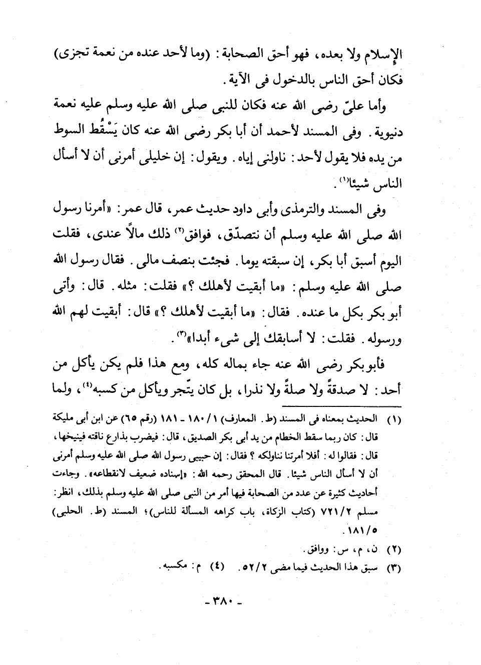 وَأَمَّا عَلِيٌّ رَضِيَ اللَّهُ عَنْهُ فَكَانَ لِلنَّبِيِّ صَلَّى اللَّهُ عَلَيْهِ وَسَلَّمَ عَلَيْهِ نِعْمَةٌ دُنْيَوِيَّةٌ، وَفِي الْمُسْنَدِ لِأَحْمَدَ أَنَّ أَبَا بَكْرٍ رَضِيَ اللَّهُ عَنْهُ كَانَ يَسْقُطُ السَّوْطُ مِنْ يَدِهِ فَلَا يَقُولُ لِأَحَدٍ: نَاوِلْنِي إِيَّاهُ، وَيَقُولُ: إِنَّ خَلِيلِي أَمَرَنِي أَنْ لَا أَسَالَ النَّاسَ شَيْئًا (¬1) .
