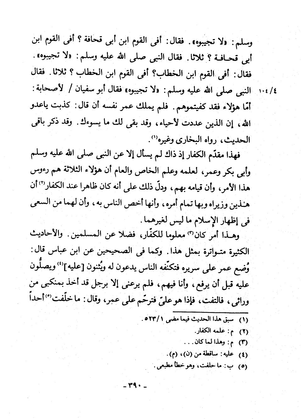 وَسَلَّمَ: " لَا تُجِيبُوهُ "، فَقَالَ: أَفِي الْقَوْمِ ابْنُ أَبِي قُحَافَةَ؟ أَفِي الْقَوْمِ ابْنُ أَبِي قُحَافَةَ؟ ثَلَاثًا، فَقَالَ النَّبِيُّ صَلَّى اللَّهُ عَلَيْهِ وَسَلَّمَ: " لَا تُجِيبُوهُ "، فَقَالَ: أَفِي الْقَوْمِ ابْنُ الْخَطَّابِ؟ أَفِي الْقَوْمِ ابْنُ الْخَطَّابِ؟ ثَلَاثًا، فَقَالَ النَّبِيُّ صَلَّى اللَّهُ عَلَيْهِ وَسَلَّمَ: " لَا تُجِيبُوهُ "، فَقَالَ أَبُو سُفْيَانَ لِأَصْحَابِهِ: أَمَّا هَؤُلَاءِ فَقَدْ كُفِيتُمُوهُمْ فَلَمْ يَمْلِكْ عُمَرُ نَفْسَهُ أَنْ قَالَ: كَذَبْتَ يَا عَدُوَّ اللَّهِ إِنَّ الَّذِينَ عَدَّدَتْ لَأَحْيَاءٌ، وَقَدْ بَقِيَ لَكَ مَا يَسُوءُكَ،» وَقَدْ ذَكَرَ بَاقِيَ الْحَدِيثِ رَوَاهُ الْبُخَارِيُّ وَغَيْرُهُ (¬1) .
