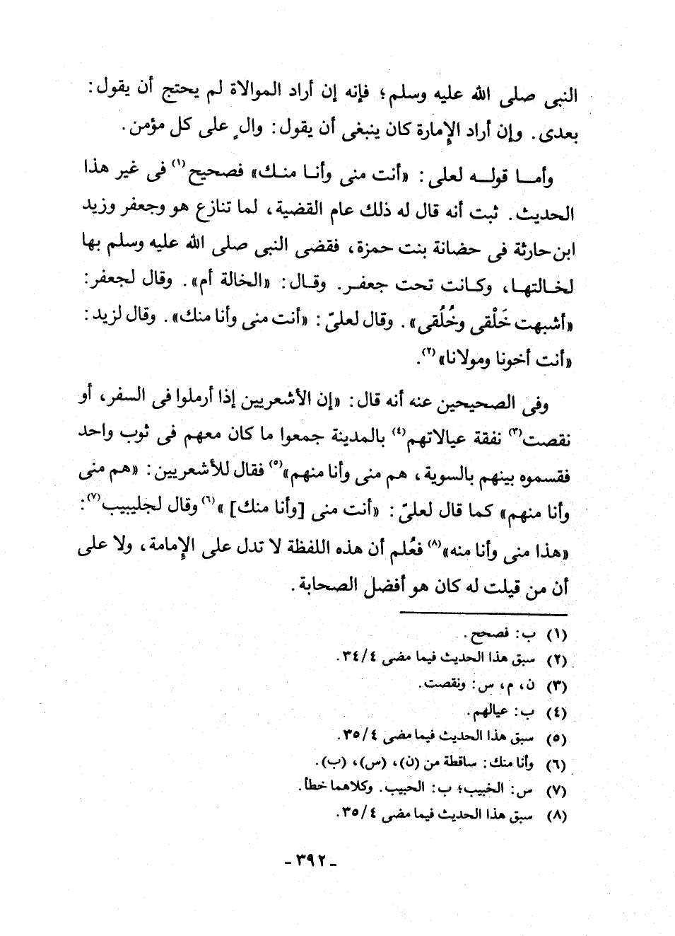 فَقَالَ لِلْأَشْعَرِيِّينَ: " «هُمْ مِنِّي، وَأَنَا مِنْهُمْ» "، كَمَا قَالَ لِعَلِيٍّ: " «أَنْتَ مِنِّي (وَأَنَا مِنْكَ) » (¬6) ". وَقَالَ لِجُلَيْبِيبٍ (¬7) : " «هَذَا مِنِّي وَأَنَا مِنْهُ» " (¬8) ، فَعُلِمَ أَنَّ هَذِهِ اللَّفْظَةَ لَا تَدُلُّ عَلَى الْإِمَامَةِ، وَلَا عَلَى أَنَّ مَنْ قِيلَتْ لَهُ كَانَ هُوَ أَفْضَلَ الصَّحَابَةِ.