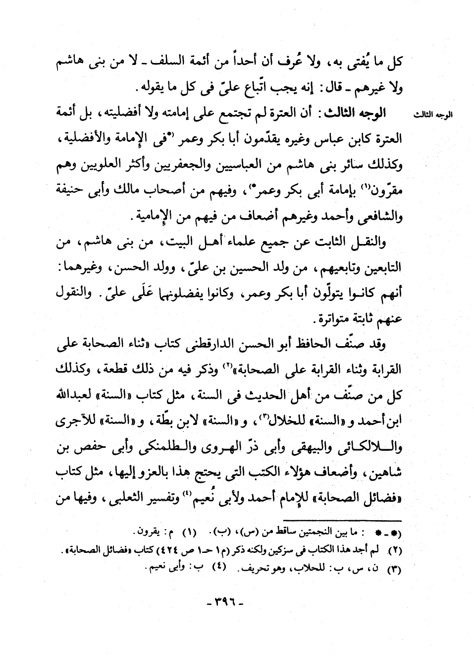 الْوَجْهُ الثَّالِثُ: أَنَّ الْعِتْرَةَ لَمْ تَجْتَمِعْ عَلَى إِمَامَتِهِ وَلَا أَفْضَلِيَّتِهِ، بَلْ أَئِمَّةُ الْعِتْرَةِ كَابْنِ عَبَّاسٍ وَغَيْرِهِ يُقَدِّمُونَ أَبَا بَكْرٍ وَعُمَرَ * فِي الْإِمَامَةِ وَالْأَفْضَلِيَّةِ، وَكَذَلِكَ سَائِرُ بَنِي هَاشِمٍ مِنَ الْعَبَّاسِيِّينَ، وَالْجَعْفَرِيِّينَ، وَأَكْثَرُ الْعَلَوِيِّينَ، وَهُمْ مُقِرُّونَ (¬1) بِإِمَامَةِ أَبِي بَكْرٍ وَعُمَرَ * (¬2) ، وَفِيهِمْ مِنْ أَصْحَابِ مَالِكٍ، وَأَبِي حَنِيفَةَ، وَالشَّافِعِيِّ، وَأَحْمَدَ، وَغَيْرِهِمْ أَضْعَافُ مَنْ فِيهِمْ مِنِ الْإِمَامِيَّةِ.
