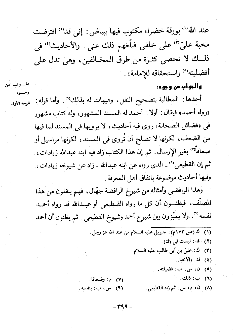 وَالْجَوَابُ مِنْ وُجُوهٍ: أَحَدُهَا: الْمُطَالَبَةُ بِتَصْحِيحِ النَّقْلِ، وَهَيْهَاتَ لَهُ بِذَلِكَ (¬6) ، وَأَمَّا قَوْلُهُ: " رَوَاهُ أَحْمَدُ " فَيُقَالُ: أَوَّلًا: أَحْمَدُ لَهُ الْمُسْنَدُ الْمَشْهُورُ، وَلَهُ كِتَابٌ مَشْهُورٌ فِي " فَضَائِلِ الصَّحَابَةِ " رَوَى فِيهِ أَحَادِيثَ لَا يَرْوِيهَا فِي الْمُسْنَدِ لِمَا فِيهَا مِنَ الضَّعْفِ ; لِكَوْنِهَا لَا تَصْلُحُ أَنْ تُرْوَى فِي الْمُسْنَدِ ; لِكَوْنِهَا مَرَاسِيلَ أَوْ ضِعَافًا (¬7) ، بِغَيْرِ الْإِرْسَالِ، ثُمَّ إِنَّ هَذَا الْكِتَابَ زَادَ فِيهِ ابْنُهُ عَبْدُ اللَّهِ زِيَادَاتٍ، ثُمَّ إِنَّ الْقَطِيعِيَّ (¬8) - الَّذِي رَوَاهُ عَنِ ابْنِهِ عَبْدِ اللَّهِ - زَادَ عَنْ شُيُوخِهِ زِيَادَاتٍ، وَفِيهَا أَحَادِيثُ مَوْضُوعَةٌ بِاتِّفَاقِ أَهْلِ الْمَعْرِفَةِ.