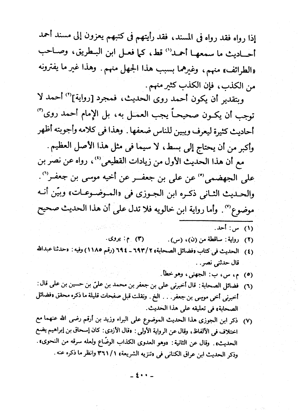 وَبِتَقْدِيرِ أَنْ يَكُونَ أَحْمَدُ رَوَى الْحَدِيثَ فَمُجَرَّدُ (رِوَايَةِ) (¬2) أَحْمَدَ لَا تُوجِبُ أَنْ يَكُونَ صَحِيحًا يَجِبُ الْعَمَلُ بِهِ، بَلِ الْإِمَامُ أَحْمَدُ رَوَى (¬3) أَحَادِيثَ كَثِيرَةً لِيُعَرِّفَ وَيُبَيِّنَ لِلنَّاسِ ضَعْفَهَا، وَهَذَا فِي كَلَامِهِ وَأَجْوِبَتِهِ أَظْهَرُ وَأَكْبَرُ مِنْ أَنْ يَحْتَاجَ إِلَى بَسْطٍ، لَا سِيَّمَا فِي مِثْلِ هَذَا الْأَصْلِ الْعَظِيمِ.