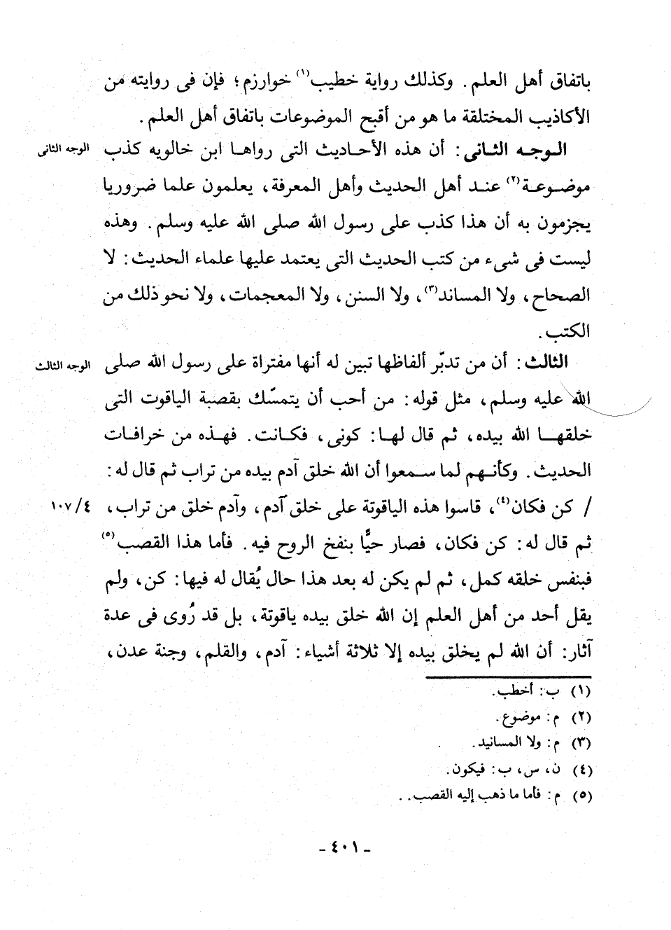 الثَّالِثُ: أَنَّ مَنْ تَدَبَّرَ أَلْفَاظَهَا تَبَيَّنَ لَهُ أَنَّهَا مُفْتَرَاةٌ عَلَى رَسُولِ اللَّهِ صَلَّى اللَّهُ عَلَيْهِ وَسَلَّمَ، مِثْلَ قَوْلِهِ: «مَنْ أَحَبَّ أَنْ يَتَمَسَّكَ بِقَصَبَةِ الْيَاقُوتِ الَّتِي خَلَقَهَا اللَّهُ بِيَدِهِ، ثُمَّ قَالَ لَهَا كُونِي فَكَانَتْ» . فَهَذِهِ مِنْ خُرَافَاتِ الْحَدِيثِ، وَكَأَنَّهُمْ لَمَّا سَمِعُوا أَنَّ اللَّهَ خَلَقَ آدَمَ بِيَدِهِ مِنْ تُرَابٍ، ثُمَّ قَالَ لَهُ: كُنْ، فَكَانَ (¬4) ، قَاسُوا هَذِهِ الْيَاقُوتَةَ عَلَى خَلْقِ آدَمَ، وَآدَمُ خُلِقَ مِنْ تُرَابٍ، ثُمَّ قَالَ لَهُ: كُنْ فَكَانَ فَصَارَ حَيًّا بِنَفْخِ الرُّوحِ فِيهِ فَأَمَّا هَذَا الْقَصَبُ (¬5) فَبِنَفْسِ خُلُقِهِ كَمُلَ، ثُمَّ لَمْ يَكُنْ لَهُ بَعْدَ هَذَا حَالٌ يُقَالُ لَهُ فِيهَا: كُنْ، وَلَمْ يَقُلْ أَحَدٌ مِنْ أَهْلِ الْعِلْمِ إِنَّ اللَّهَ خَلَقَ بِيَدِهِ يَاقُوتَةً، بَلْ قَدْ رُوِيَ فِي عِدَّةِ آثَارٍ: أَنَّ اللَّهَ لَمْ يَخْلُقْ بِيَدِهِ إِلَّا ثَلَاثَةَ أَشْيَاءَ: آدَمَ، وَالْقَلَمَ، وَجَنَّةَ عَدْنٍ،