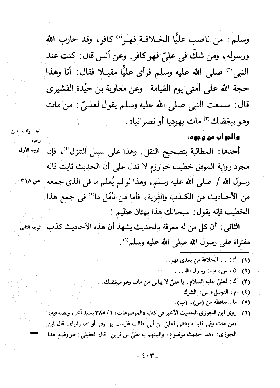 (¬6) رَوَى ابْنُ الْجَوْزِيِّ الْحَدِيثَ الْأَخِيرَ فِي كِتَابِهِ " الْمَوْضُوعَاتِ " 1/381 بِسَنَدٍ آخَرَ، وَنَصُّهُ فِيهِ: " مَنْ مَاتَ وَفِي قَلْبِهِ بُغْضٌ لِعَلِيِّ بْنِ أَبِي طَالِبٍ فَلْيَمُتْ يَهُودِيًا أَوْ نَصْرَانِيًا " قَالَ ابْنُ الْجَوْزِيِّ: " هَذَا حَدِيثٌ مَوْضُوعٌ، وَالْمُتَّهَمُ بِهِ عَلِيُّ بْنُ قِرْي. قَالَ الْعُقَيْلِيُّ: هُوَ وَضَعَ هَذَا الْحَدِيثَ، وَقَالَ يَحْيَى بْنُ مَعِينٍ: هَذَا كَذَّابٌ خَبِيثٌ. وَقَالَ الْبَغَوِيُّ: كَانَ يَكْذِبُ " وَأَمَّا الْحَدِيثُ الْأَوَّلُ فَلَمْ أَجِدْهُ وَلَكِنْ ذَكَرَ السُّيُوطِيُّ حَدِيثًا مَوْضُوعًا مَنْسُوبًا إِلَى جَابِرٍ رَضِيَ اللَّهُ عَنْهُ فِي كِتَابِهِ " اللَّآلِئِ الْمَصْنُوعَةِ " 1/328 وَنَصُّهُ: " عَلِيٌّ خَيْرُ الْبَشَرِ فَمَنْ أَبَى فَقَدْ كَفَرَ " وَانْظُرْ كَلَامَ السُّيُوطِيِّ عَلَيْهِ.