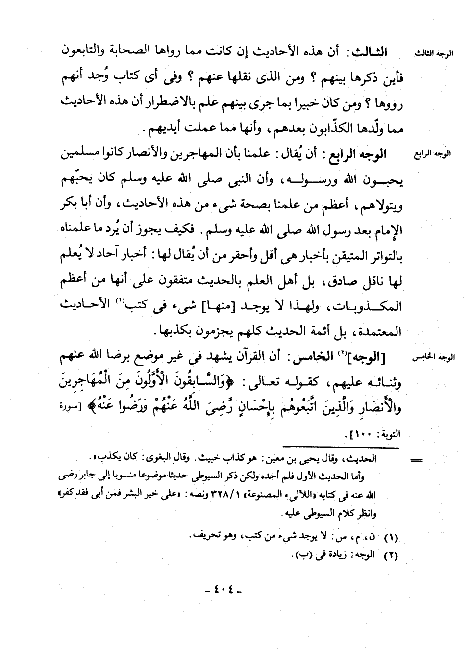 الْوَجْهُ الرَّابِعُ: أَنْ يُقَالَ: عِلْمُنَا بِأَنَّ الْمُهَاجِرِينَ وَالْأَنْصَارَ كَانُوا مُسْلِمِينَ يُحِبُّونَ اللَّهَ وَرَسُولَهُ، وَأَنَّ النَّبِيَّ صَلَّى اللَّهُ عَلَيْهِ وَسَلَّمَ كَانَ يُحِبُّهُمْ وَيَتَوَلَّاهُمْ، أَعْظَمُ مِنْ عِلْمِنَا بِصِحَّةِ شَيْءٍ مِنْ هَذِهِ الْأَحَادِيثِ، وَأَنَّ أَبَا بَكْرٍ الْإِمَامُ بَعْدَ رَسُولِ اللَّهِ صَلَّى اللَّهُ عَلَيْهِ وَسَلَّمَ، فَكَيْفَ يَجُوزُ أَنْ يُرَدَّ مَا عَلِمْنَاهُ بِالتَّوَاتُرِ الْمُتَيَقَّنِ بِأَخْبَارٍ هِيَ أَقَلُّ وَأَحْقَرُ مِنْ أَنْ يُقَالَ لَهَا: أَخْبَارُ آحَادٍ لَا يُعْلَمُ لَهَا نَاقِلٌ صَادِقٌ، بَلْ أَهْلُ الْعِلْمِ بِالْحَدِيثِ مُتَّفِقُونَ عَلَى أَنَّهَا مِنْ أَعْظَمِ الْمَكْذُوبَاتِ، وَلِهَذَا لَا يُوجَدُ (مِنْهَا) شَيْءٌ فِي كُتُبِ (¬1) الْأَحَادِيثِ الْمُعْتَمَدَةِ، بَلْ أَئِمَّةُ الْحَدِيثِ كُلُّهُمْ يَجْزِمُونَ بِكَذِبِهَا.