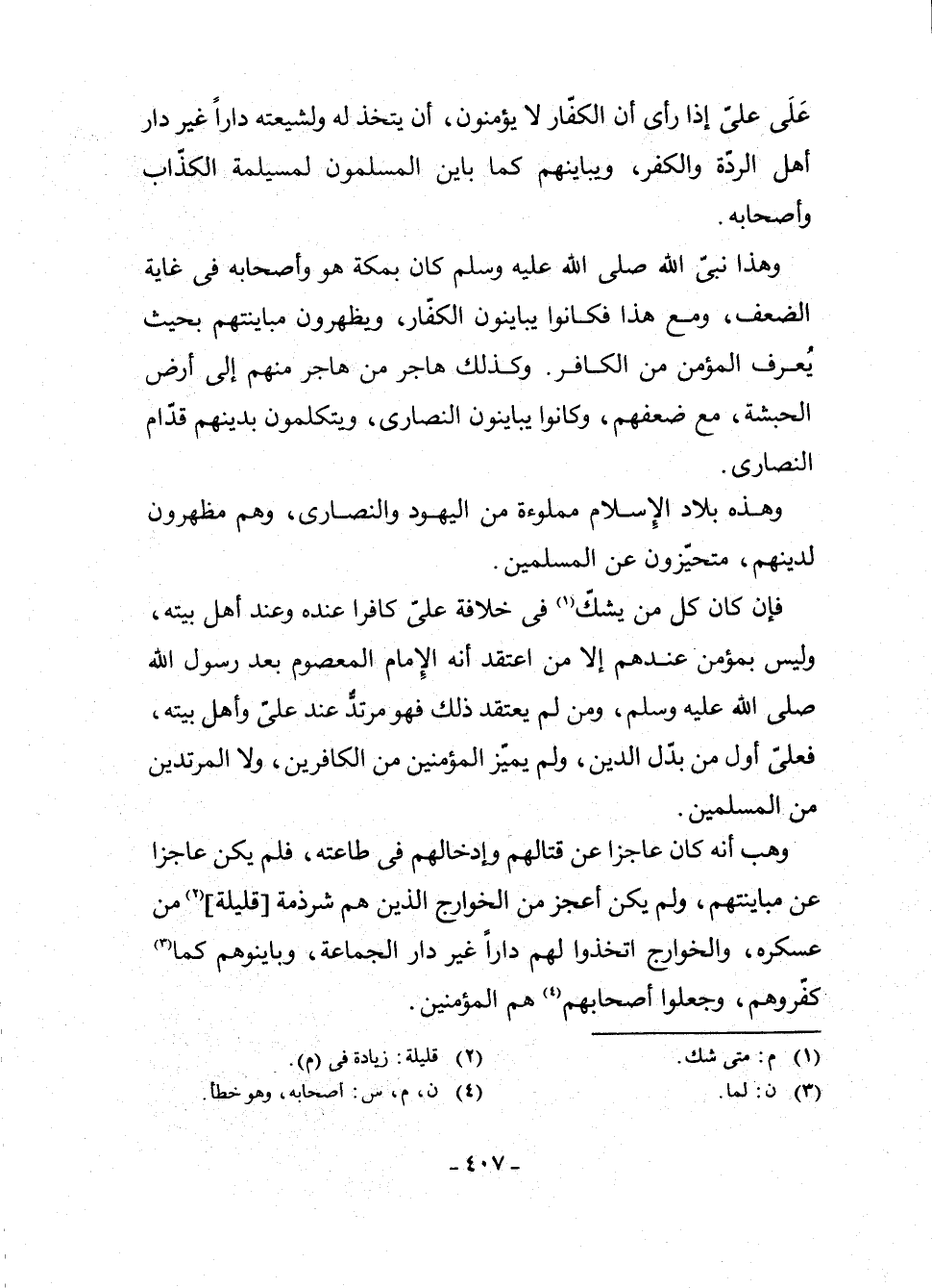 فَإِنْ كَانَ كُلُّ مَنْ يَشُكُّ (¬1) فِي خِلَافَةِ عَلِيٍّ كَافِرًا عِنْدَهُ وَعِنْدَ أَهْلِ بَيْتِهِ، وَلَيْسَ بِمُؤْمِنٍ عِنْدَهُمْ إِلَّا مَنِ اعْتَقَدَ أَنَّهُ الْإِمَامُ الْمَعْصُومُ بَعْدَ رَسُولِ اللَّهِ صَلَّى اللَّهُ عَلَيْهِ وَسَلَّمَ، وَمَنْ لَمْ يَعْتَقِدْ ذَلِكَ فَهُوَ مُرْتَدٌّ عِنْدَ عَلِيٍّ وَأَهْلِ بَيْتِهِ، فَعَلِيٌّ أَوَّلُ مَنْ بَدَّلَ الدِّينَ، وَلَمْ يُمَيِّزِ الْمُؤْمِنِينَ مِنَ الْكَافِرِينَ، وَلَا الْمُرْتَدِّينَ مِنَ الْمُسْلِمِينَ.