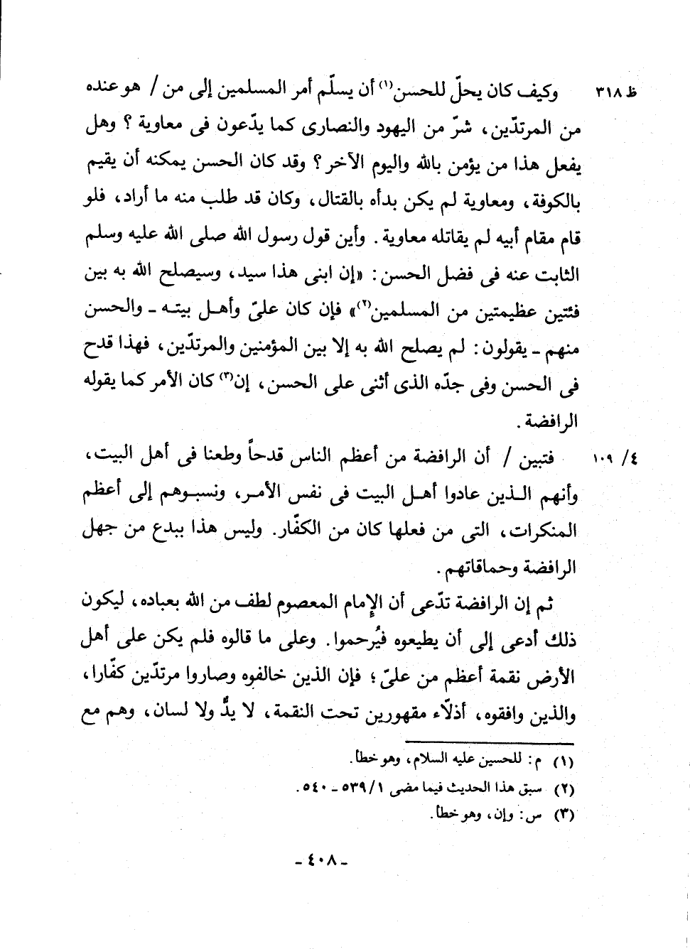 وَكَيْفَ كَانَ يَحِلُّ لِلْحَسَنِ (¬1) أَنْ يُسْلِمَ أَمْرَ الْمُسْلِمِينَ إِلَى مَنْ هُوَ عِنْدَهُ مِنَ الْمُرْتَدِّينَ شَرٌّ مِنَ الْيَهُودِ وَالنَّصَارَى، كَمَا يَدَّعُونَ فِي مُعَاوِيَةَ؟ وَهَلْ يَفْعَلُ هَذَا مَنْ يُؤْمِنُ بِاللَّهِ وَالْيَوْمِ الْآخِرِ؟ وَقَدْ كَانَ الْحَسَنُ يُمْكِنُهُ أَنْ يُقِيمَ بِالْكُوفَةِ، وَمُعَاوِيَةُ لَمْ يَكُنْ بَدَأَهُ بِالْقِتَالِ، وَكَانَ قَدْ طُلِبَ مِنْهُ مَا أَرَادَ فَلَوْ قَامَ مَقَامَ أَبِيهِ لَمْ يُقَاتِلْهُ مُعَاوِيَةُ، وَأَيْنَ قَوْلُ رَسُولِ اللَّهِ صَلَّى اللَّهُ عَلَيْهِ وَسَلَّمَ الثَّابِتُ عَنْهُ فِي فَضْلِ الْحَسَنِ: «إِنَّ ابْنِي هَذَا سَيِّدٌ، وَسَيُصْلِحُ اللَّهُ بِهِ بَيْنَ فِئَتَيْنِ عَظِيمَتَيْنِ مِنَ الْمُسْلِمِينَ» (¬2) ، فَإِنْ كَانَ عَلِيٌّ وَأَهْلُ بَيْتِهِ - وَالْحَسَنُ مِنْهُمْ - يَقُولُونَ: لَمْ يُصْلِحِ اللَّهُ بِهِ إِلَّا بَيْنَ الْمُؤْمِنِينَ وَالْمُرْتَدِّينَ فَهَذَا قَدْحٌ فِي الْحَسَنِ، وَفِي جَدِّهِ الَّذِي أَثْنَى عَلَى الْحَسَنِ، (¬3) : لَمَّا كَانَ الْأَمْرُ كَمَا يَقُولُهُ الرَّافِضَةُ.