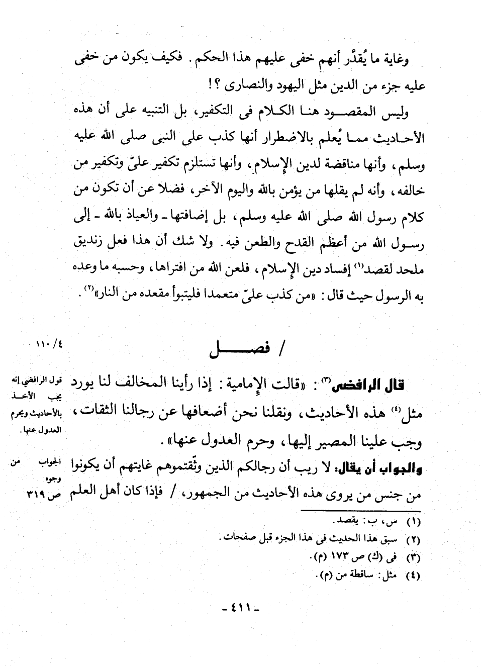 قَالَ الرَّافِضِيُّ (¬3) : " قَالَتِ الْإِمَامِيَّةُ إِذَا رَأَيْنَا الْمُخَالِفَ لَنَا يُورِدُ مِثْلَ (¬4) هَذِهِ الْأَحَادِيثِ، وَنَقَلْنَا نَحْنُ أَضْعَافَهَا عَنْ رِجَالِنَا الثِّقَاتِ، وَجَبَ عَلَيْنَا الْمَصِيرُ إِلَيْهَا، وَحُرِّمَ الْعُدُولُ عَنْهَا ".