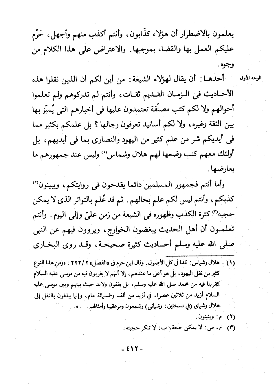 أَحَدُهَا: أَنْ يُقَالَ لِهَؤُلَاءِ الشِّيعَةِ: مِنْ أَيْنَ لَكُمْ أَنَّ الَّذِينَ نَقَلُوا هَذِهِ الْأَحَادِيثَ فِي الزَّمَانِ الْقَدِيمِ ثِقَاتٌ، وَأَنْتُمْ لَمْ تُدْرِكُوهُمْ وَلَمْ تَعْلَمُوا أَحْوَالَهُمْ، وَلَا لَكُمْ كُتُبٌ مُصَنَّفَةٌ تَعْتَمِدُونَ عَلَيْهَا فِي أَخْبَارِهِمُ الَّتِي يُمَيَّزُ بِهَا بَيْنَ الثِّقَةِ وَغَيْرِهِ، وَلَا لَكُمْ أَسَانِيدُ تَعْرِفُونَ رِجَالَهَا، بَلْ عِلْمُكُمْ بِكَثِيرٍ مِمَّا فِي أَيْدِيكُمْ شَرٌّ مِنْ عِلْمِ كَثِيرٍ مِنَ الْيَهُودِ وَالنَّصَارَى بِمَا فِي أَيْدِيهِمْ، بَلْ أُولَئِكَ مَعَهُمْ كُتُبٌ وَضَعَهَا لَهُمْ هِلَالٌ وَشَمَّاسٌ (¬1) . . .، وَلَيْسَ عِنْدَ جُمْهُورِهِمْ مَا يُعَارِضُهَا.