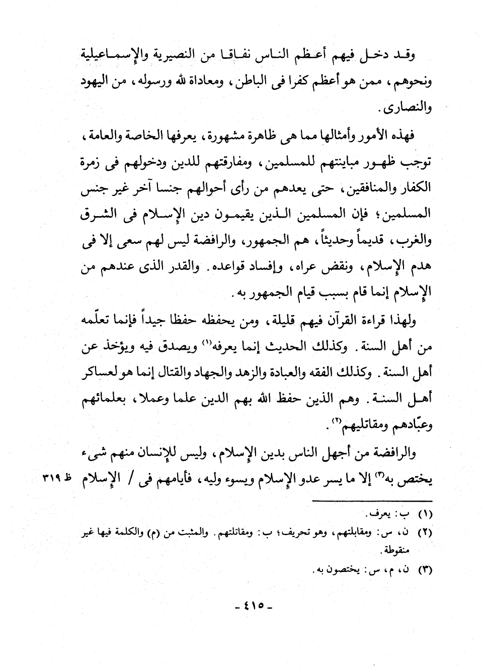 فَهَذِهِ الْأُمُورُ وَأَمْثَالُهَا مِمَّا هِيَ ظَاهِرَةٌ مَشْهُورَةٌ يَعْرِفُهَا الْخَاصَّةُ وَالْعَامَّةُ تُوجِبُ ظُهُورَ مُبَايَنَتِهِمْ لِلْمُسْلِمِينَ وَمُفَارَقَتِهِمْ لِلدِّينِ، وَدُخُولِهِمْ فِي زُمْرَةِ الْكُفَّارِ وَالْمُنَافِقِينَ حَتَّى يَعُدُّهُمْ مَنْ رَأَى أَحْوَالَهُمْ جِنْسًا آخَرَ غَيْرَ جِنْسِ الْمُسْلِمِينَ، فَإِنَّ الْمُسْلِمِينَ الَّذِينَ يُقِيمُونَ دِينَ الْإِسْلَامِ فِي الشَّرْقِ وَالْغَرْبِ قَدِيمًا وَحَدِيثًا هُمُ الْجُمْهُورُ، وَالرَّافِضَةُ لَيْسَ لَهُمْ سَعْيٌ إِلَّا فِي هَدْمِ الْإِسْلَامِ، وَنَقْضِ عُرَاهُ، وَإِفْسَادِ قَوَاعِدِهِ، وَالْقَدْرُ الَّذِي عِنْدَهُمْ مِنَ الْإِسْلَامِ إِنَّمَا قَامَ بِسَبَبِ قِيَامِ الْجُمْهُورِ بِهِ.