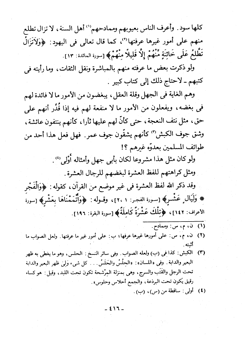 كُلُّهَا سُودٌ، وَأَعْرَفُ النَّاسِ بِعُيُوبِهِمْ وَمَمَادِحِهِمْ (¬1) أَهْلُ السُّنَّةِ لَا تَزَالُ تَطَّلِعُ مِنْهُمْ عَلَى أُمُورٍ غَيْرِهَا عَرَفَتْهَا (¬2) ، كَمَا قَالَ تَعَالَى فِي الْيَهُودِ: {وَلَا تَزَالُ تَطَّلِعُ عَلَى خَائِنَةٍ مِنْهُمْ إِلَّا قَلِيلًا مِنْهُمْ} (سُورَةُ الْمَائِدَةِ: 13) .