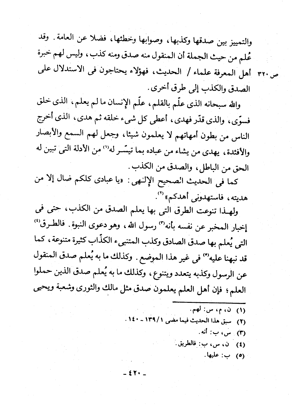 وَالتَّمْيِيزِ بَيْنَ صِدْقِهَا وَكَذِبِهَا، وَصَوَابِهَا وَخَطَئِهَا، فَضْلًا عَنِ الْعَامَّةِ، وَقَدْ عُلِمَ مِنْ حَيْثُ الْجُمْلَةُ أَنَّ الْمَنْقُولَ مِنْهُ صِدْقٌ وَمِنْهُ كَذِبٌ، وَلَيْسَ لَهُمْ خِبْرَةُ أَهْلِ الْمَعْرِفَةِ عُلَمَاءِ الْحَدِيثِ، فَهَؤُلَاءِ يَحْتَاجُونَ فِي الِاسْتِدْلَالِ عَلَى الصِّدْقِ وَالْكَذِبِ إِلَى طُرُقٍ أُخْرَى.