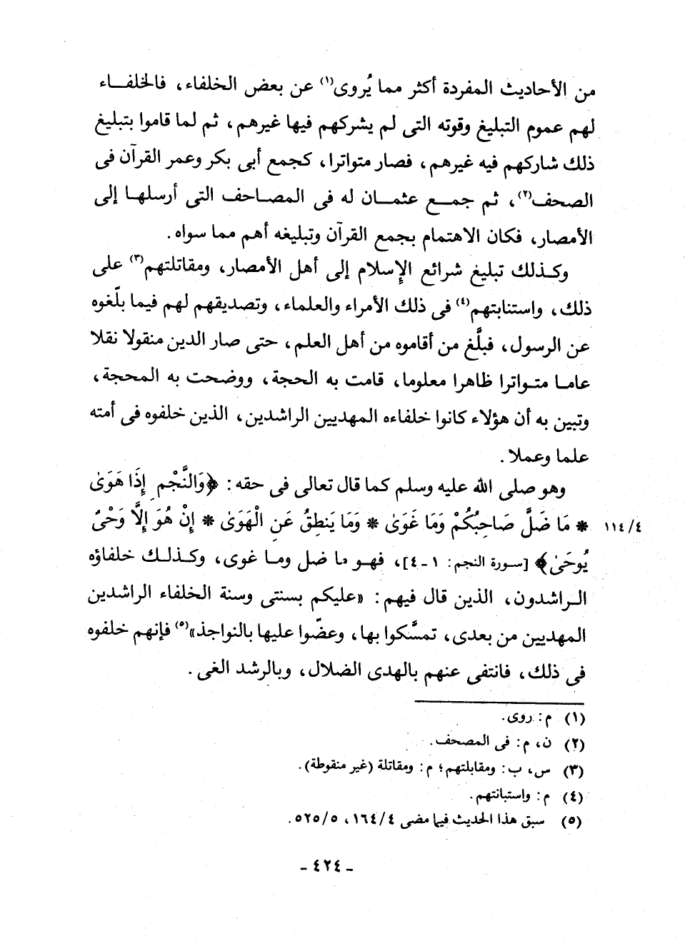 وَهُوَ صَلَّى اللَّهُ عَلَيْهِ وَسَلَّمَ، كَمَا قَالَ تَعَالَى فِي حَقِّهِ: {وَالنَّجْمِ إِذَا هَوَى - مَا ضَلَّ صَاحِبُكُمْ وَمَا غَوَى - وَمَا يَنْطِقُ عَنِ الْهَوَى - إِنْ هُوَ إِلَّا وَحْيٌ يُوحَى} (سُورَةِ النَّجْمِ: 1 - 4) فَهُوَ مَا ضَلَّ وَمَا غَوَى، وَكَذَلِكَ خُلَفَاؤُهُ الرَّاشِدُونَ، الَّذِينَ قَالَ فِيهِمْ: " «عَلَيْكُمْ بِسُنَّتِي وَسُنَّةِ الْخُلَفَاءِ الرَّاشِدِينَ الْمَهْدِيِّينَ مِنْ بَعْدِي، تَمَسَّكُوا بِهَا، وَعَضُّوا عَلَيْهَا بِالنَّوَاجِذِ» " (¬5) فَإِنَّهُمْ خَلَفُوهُ فِي ذَلِكَ، فَانْتَفَى عَنْهُمْ بِالْهُدَى الضَّلَالُ، وَبِالرُّشْدِ الْغَيُّ.
