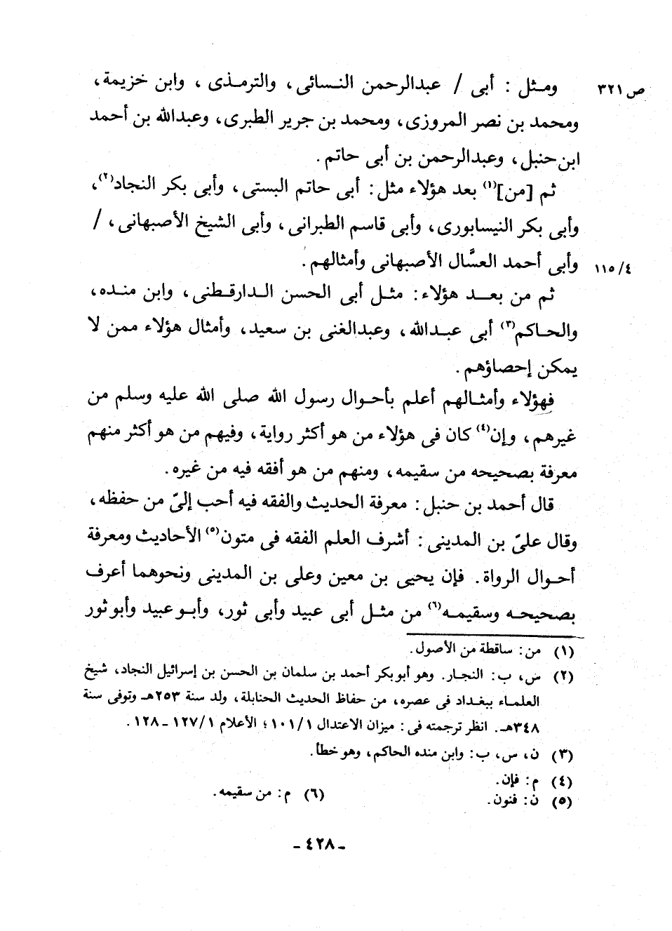 وَمِثْلَ: أَبِي عَبْدِ الرَّحْمَنِ النَّسَائِيِّ، وَالتِّرْمِذِيِّ، وَابْنِ خُزَيْمَةَ، وَمُحَمَّدِ بْنِ نَصْرٍ الْمَرْوَزِيِّ، وَمُحَمَّدِ بْنِ جَرِيرٍ الطَّبَرِيِّ، وَعَبْدِ اللَّهِ بْنِ أَحْمَدَ بْنِ حَنْبَلٍ، وَعَبْدِ الرَّحْمَنِ بْنِ أَبِي حَاتِمٍ.