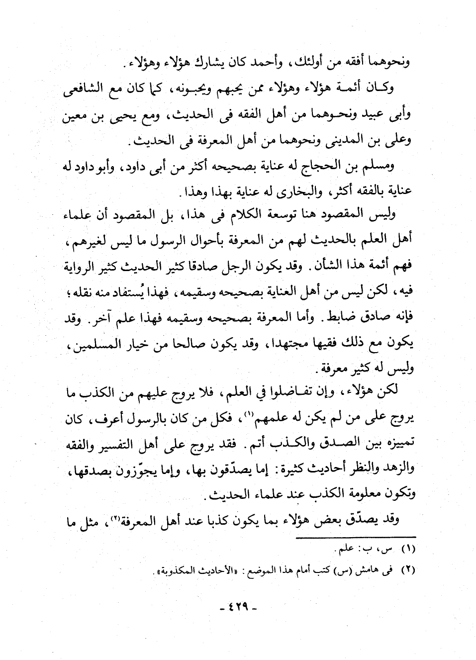 وَلَيْسَ الْمَقْصُودُ هُنَا تَوْسِعَةَ الْكَلَامِ فِي هَذَا، بَلِ الْمَقْصُودُ أَنَّ عُلَمَاءَ أَهْلِ الْعِلْمِ بِالْحَدِيثِ لَهُمْ مِنَ الْمَعْرِفَةِ بِأَحْوَالِ الرَّسُولِ مَا لَيْسَ لِغَيْرِهِمْ فَهُمْ أَئِمَّةُ هَذَا الشَّأْنِ، وَقَدْ يَكُونُ الرَّجُلُ صَادِقًا كَثِيرَ الْحَدِيثِ كَثِيرَ الرِّوَايَةِ فِيهِ لَكِنْ لَيْسَ مِنْ أَهْلِ الْعِنَايَةِ بِصَحِيحِهِ وَسَقِيمِهِ، فَهَذَا يُسْتَفَادُ مِنْهُ نَقْلُهُ، فَإِنَّهُ صَادِقٌ ضَابِطٌ، وَأَمَّا الْمَعْرِفَةُ بِصَحِيحِهِ وَسَقِيمِهِ فَهَذَا عِلْمٌ آخَرُ، وَقَدْ يَكُونُ مَعَ ذَلِكَ فَقِيهًا مُجْتَهِدًا، وَقَدْ يَكُونُ صَالِحًا مِنْ خِيَارِ الْمُسْلِمِينَ، وَلَيْسَ لَهُ كَثِيرُ مَعْرِفَةٍ.