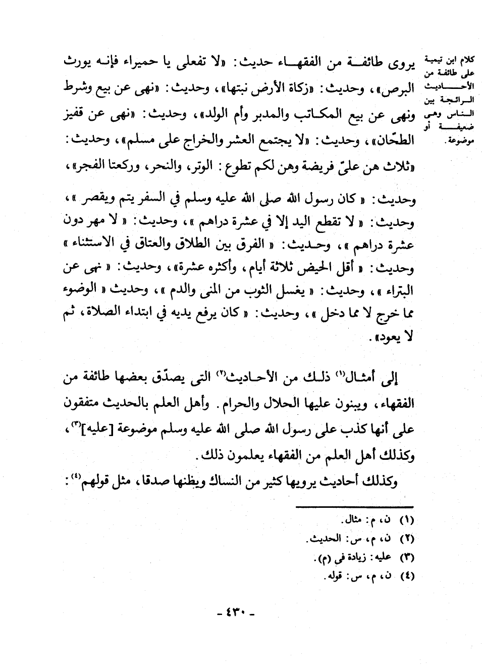إِلَى أَمْثَالِ (¬1) ذَلِكَ مِنَ الْأَحَادِيثِ (¬2) الَّتِي يُصَدِّقُ بَعْضَهَا طَائِفَةٌ مِنَ الْفُقَهَاءِ، وَيَبْنُونَ عَلَيْهَا الْحَلَالَ وَالْحَرَامَ، وَأَهْلُ الْعِلْمِ بِالْحَدِيثِ مُتَّفِقُونَ عَلَى أَنَّهَا كَذِبٌ عَلَى رَسُولِ اللَّهِ صَلَّى اللَّهُ عَلَيْهِ وَسَلَّمَ مَوْضُوعَةٌ (عَلَيْهِ) (¬3) ، وَكَذَلِكَ أَهْلُ الْعِلْمِ مِنَ الْفُقَهَاءِ يَعْلَمُونَ ذَلِكَ.