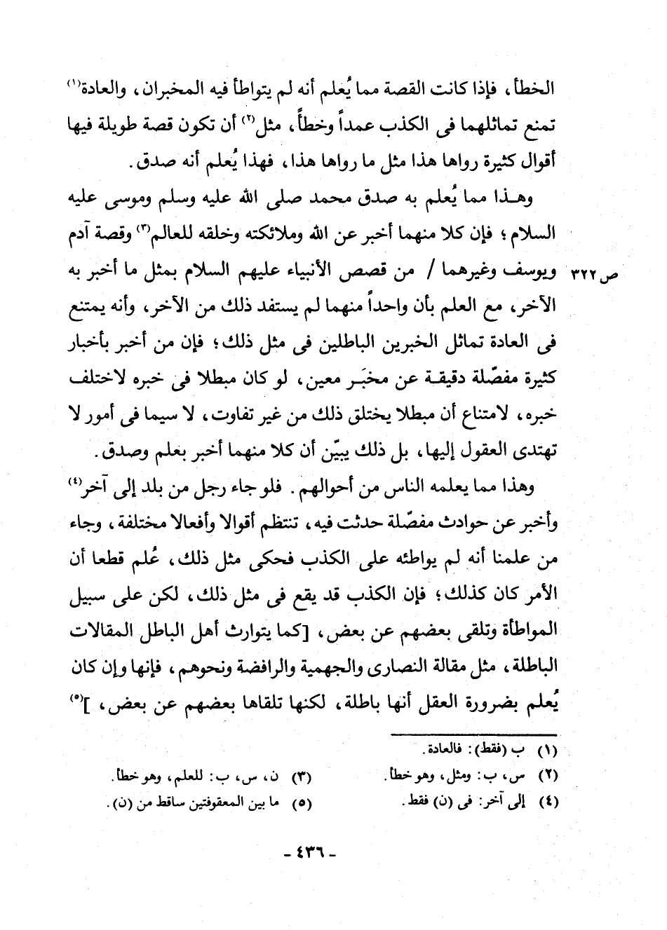 وَهَذَا مِمَّا يَعْلَمُهُ النَّاسُ مِنْ أَحْوَالِهِمْ فَلَوْ جَاءَ رَجُلٌ مِنْ بَلَدٍ إِلَى آخَرَ (¬4) وَأَخْبَرَ عَنْ حَوَادِثَ مُفَصَّلَةٍ حَدَثَتْ فِيهِ، تَنْتَطِمُ أَقْوَالًا وَأَفْعَالًا مُخْتَلِفَةً، وَجَاءَ مَنْ عَلِمْنَا أَنَّهُ لَمْ يُوَاطِئْهُ عَلَى الْكَذِبِ فَحَكَى مِثْلَ ذَلِكَ، عُلِمَ قَطْعًا أَنَّ الْأَمْرَ كَانَ كَذَلِكَ، فَإِنَّ الْكَذِبَ قَدْ يَقَعُ فِي مِثْلِ ذَلِكَ، لَكِنْ عَلَى سَبِيلِ الْمُوَاطَأَةِ وَتَلَقِّي بَعْضِهِمْ عَنْ بَعْضٍ، (كَمَا يَتَوَارَثُ أَهْلُ الْبَاطِلِ الْمَقَالَاتِ الْبَاطِلَةَ مِثْلَ مَقَالَةِ النَّصَارَى وَالْجَهْمَيَّةِ وَالرَّافِضَةِ وَنَحْوِهِمْ، فَإِنَّهَا وَإِنْ كَانَ يُعْلَمُ بِضَرُورَةِ الْعَقْلِ أَنَّهَا بَاطِلَةٌ، لَكِنَّهَا تَلَقَّاهَا بَعْضُهُمْ عَنْ بَعْضٍ،) (¬5)