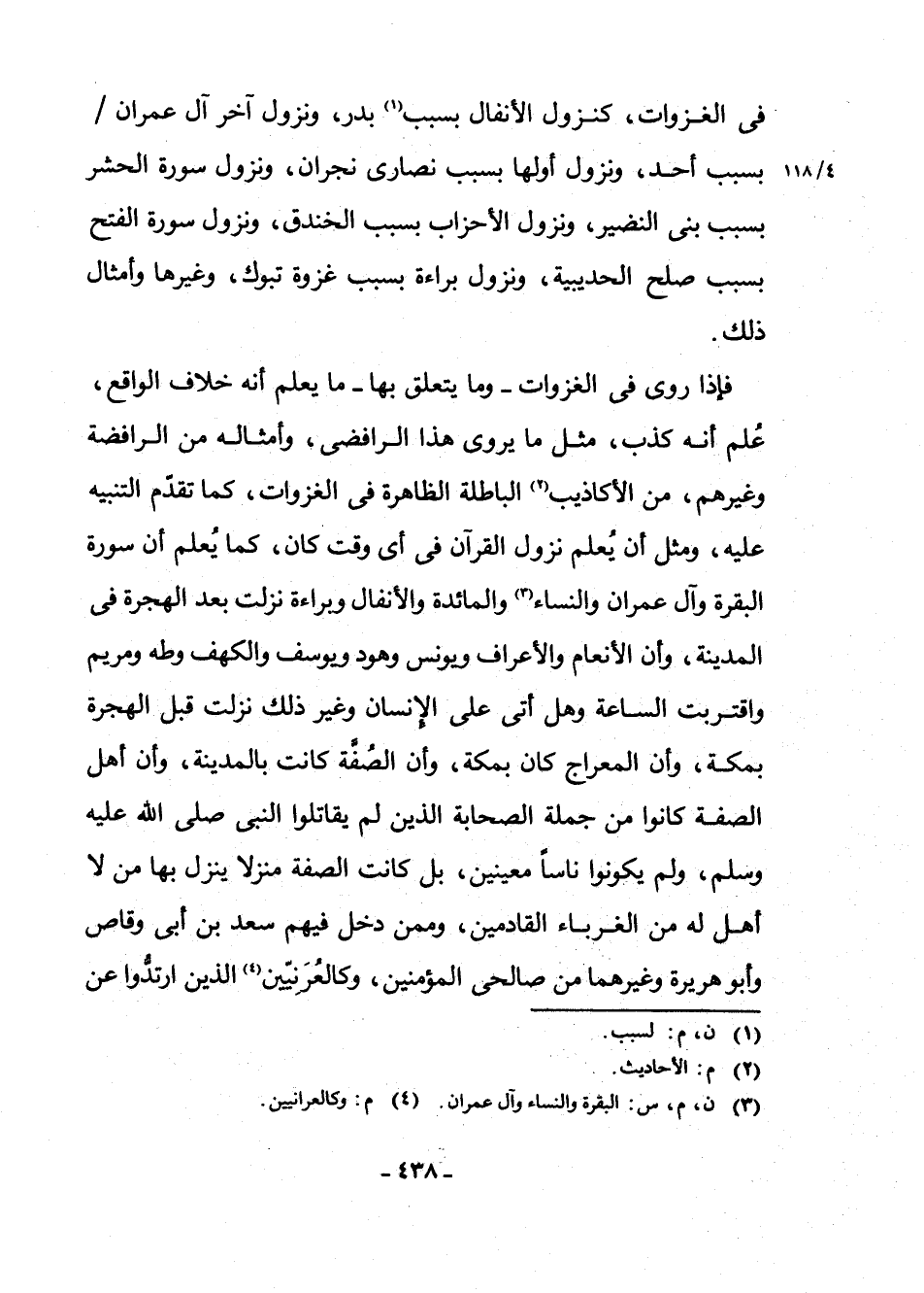 فَإِذَا رُوِيَ فِي الْغَزَوَاتِ - وَمَا يَتَعَلَّقُ بِهَا - مَا يُعْلَمُ أَنَّهُ خِلَافُ الْوَاقِعِ عُلِمَ أَنَّهُ كَذِبٌ، مِثْلَ مَا يَرْوِي هَذَا الرَّافِضِيُّ، وَأَمْثَالُهُ مِنَ الرَّافِضَةِ وَغَيْرِهِمْ مِنَ الْأَكَاذِيبِ (¬2) الْبَاطِلَةِ الظَّاهِرَةِ فِي الْغَزَوَاتِ، كَمَا تَقَدَّمَ التَّنْبِيهُ عَلَيْهِ، وَمِثْلَ أَنْ يُعْلَمَ نُزُولُ الْقُرْآنِ فِي أَيِّ وَقْتٍ كَانَ، كَمَا يُعْلَمُ أَنَّ سُورَةَ الْبَقَرَةِ، وَآلِ عِمْرَانَ، وَالنِّسَاءِ (¬3) ، وَالْمَائِدَةِ، وَالْأَنْفَالِ، وَبَرَاءَةَ نَزَلَتْ بَعْدَ الْهِجْرَةِ فِي الْمَدِينَةِ، وَأَنَّ الْأَنْعَامَ، وَالْأَعْرَافَ، وَيُونُسَ، وَهُودًا، وَيُوسُفَ، وَالْكَهْفَ، وَطه، وَمَرْيَمَ، وَاقْتَرَبَتِ السَّاعَةُ، وَهَلْ أَتَى عَلَى الْإِنْسَانِ، وَغَيْرَ ذَلِكَ نَزَلَتْ قَبْلَ الْهِجْرَةِ بِمَكَّةَ، وَأَنَّ الْمِعْرَاجَ كَانَ بِمَكَّةَ، وَأَنَّ الصُّفَّةَ كَانَتْ بِالْمَدِينَةِ، وَأَنَّ أَهْلَ الصُّفَّةِ كَانُوا مِنْ جُمْلَةِ الصَّحَابَةِ الَّذِينَ لَمْ يُقَاتِلُوا النَّبِيَّ صَلَّى اللَّهُ عَلَيْهِ وَسَلَّمَ، وَلَمْ يَكُونُوا نَاسًا مُعَيَّنِينَ، بَلْ كَانَتِ الصُّفَّةُ مَنْزِلًا يَنْزِلُ بِهَا مَنْ لَا أَهْلَ لَهُ مِنَ الْغُرَبَاءِ الْقَادِمِينَ، وَمِمَّنْ دَخَلَ فِيهِمْ سَعْدُ بْنُ أَبِي وَقَّاصٍ، وَأَبُو هُرَيْرَةَ، وَغَيْرُهُمَا مِنْ صَالِحِي الْمُؤْمِنِينَ، وَكَالْعُرَنِيِّينَ (¬4) الَّذِينَ ارْتَدُّوا عَنِ