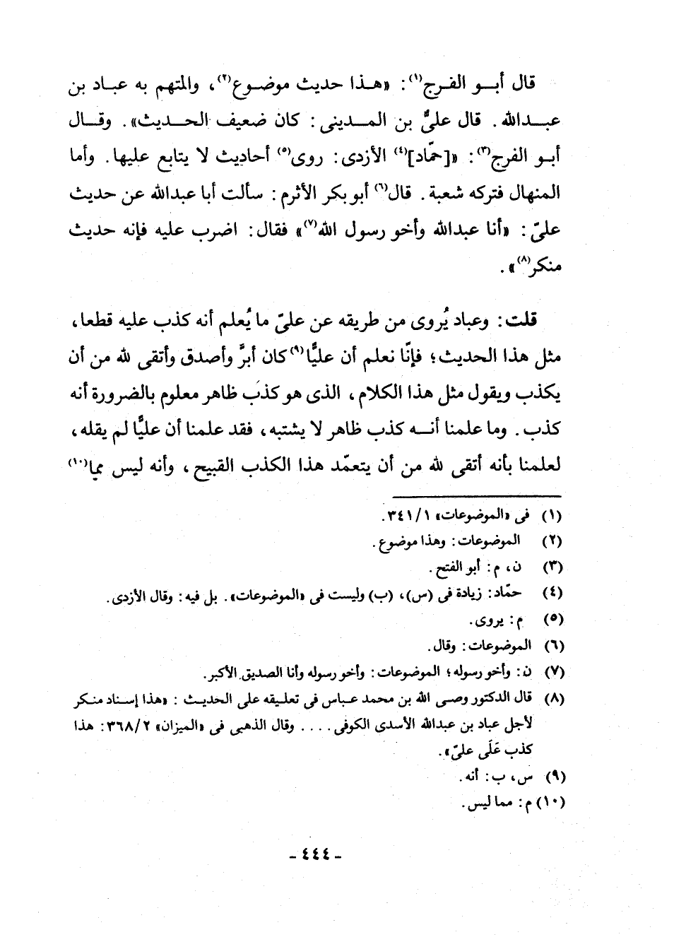 (¬8) قَالَ الدُّكْتُورُ وَصِيُّ اللَّهِ بْنُ مُحَمَّدٍ عَبَّاسٍ فِي تَعْلِيقِهِ عَلَى الْحَدِيثِ: " هَذَا إِسْنَادٌ مُنْكَرٌ لِأَجْلِ عَبَّادِ بْنِ عَبْدِ اللَّهِ الْأَسَدِيِّ الْكُوفِيِّ. . . وَقَالَ الذَّهَبِيُّ فِي " الْمِيزَانِ " 2/368: هَذَا كَذِبٌ عَلَى عَلِيٍّ "