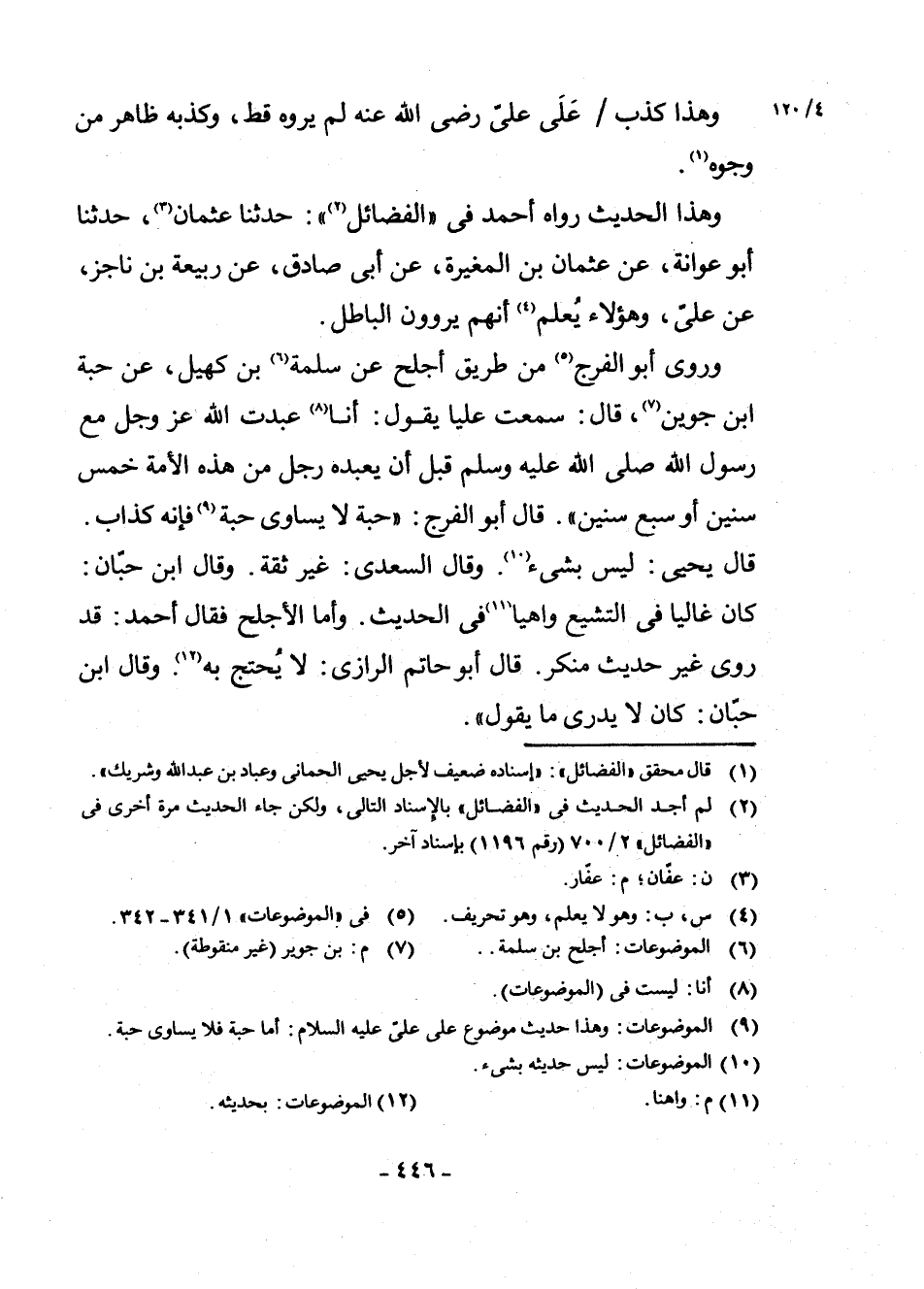 (¬9) الْمَوْضُوعَاتِ: وَهَذَا حَدِيثٌ مُوضَعٌ عَلَى عَلِيٍّ عَلَيْهِ السَّلَامُ: أَمَّا حَبَّةُ فَلَا يُسَاوِي حَبَّةً