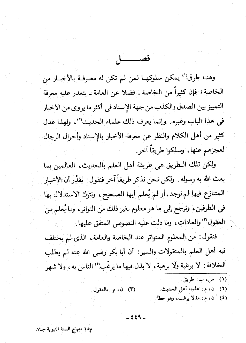 وَلَكِنَّ تِلْكَ الطَّرِيقَ هِيَ طَرِيقَةُ أَهْلِ الْعِلْمِ بِالْحَدِيثِ، الْعَالِمِينَ بِمَا بَعَثَ اللَّهُ بِهِ رَسُولَهُ، وَلَكِنْ نَحْنُ نَذْكُرُ طَرِيقًا آخَرَ، فَنَقُولُ: نُقَدِّرُ أَنَّ الْأَخْبَارَ الْمُتَنَازَعَ فِيهَا لَمْ تُوجَدْ، أَوْ لَمْ يُعْلَمْ أَيُّهَا الصَّحِيحُ، وَنَتْرُكُ الِاسْتِدْلَالَ بِهَا فِي الطَّرَفَيْنِ، وَنَرْجِعُ إِلَى مَا هُوَ مَعْلُومٌ بِغَيْرِ ذَلِكَ مِنَ التَّوَاتُرِ، وَمَا يُعْلَمُ مِنَ الْعُقُولِ (¬3) وَالْعَادَاتِ، وَمَا دَلَّتْ عَلَيْهِ النُّصُوصُ الْمُتَّفَقُ عَلَيْهَا.
