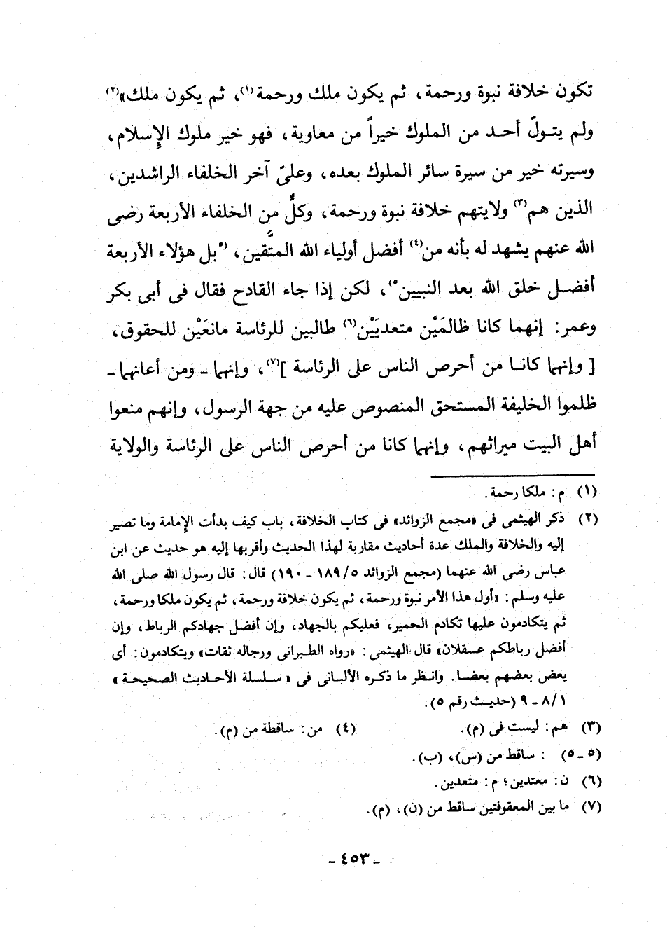 (¬2) ذَكَرَ الْهَيْثَمِيُّ فِي " مَجْمَعِ الزَّوَائِدِ " فِي كِتَابِ الْخِلَافَةِ، بَابُ كَيْفَ بَدَأَتِ الْإِمَامَةُ وَمَا تَصِيرُ إِلَيْهِ وَالْخِلَافَةُ وَالْمُلْكُ عِدَّةَ أَحَادِيثَ مُقَارِبَةً لِهَذَا الْحَدِيثِ، وَأَقْرَبُهَا إِلَيْهِ هُوَ حَدِيثٌ عَنِ ابْنِ عَبَّاسٍ رَضِيَ اللَّهُ عَنْهُمَا (مَجْمَعِ الزَّوَائِدِ 5/189 190) ، قَالَ: قَالَ رَسُولُ اللَّهِ صَلَّى اللَّهُ عَلَيْهِ وَسَلَّمَ: " أَوَّلُ هَذَا الْأَمْرِ نُبُوَّةٌ وَرَحْمَةٌ، ثُمَّ يَكُونُ خِلَافَةً وَرَحْمَةً، ثُمَّ يَكُونُ مُلْكًا وَرَحْمَةً، ثُمَّ يَتَكَادَمُونَ عَلَيْهَا تَكَادُمَ الْحَمِيرِ، فَعَلَيْكُمْ بِالْجِهَادِ، وَإِنَّ أَفْضَلَ جِهَادِكُمُ الرِّبَاطُ، وَإِنَّ أَفْضَلَ رِبَاطِكُمْ عَسْقَلَانُ ". قَالَ الْهَيْثَمِيُّ: " رَوَاهُ الطَّبَرَانِيُّ وَرِجَالُهُ ثِقَاتٌ " وَيَتَكَادَمُونَ: أَيْ يَعَضُّ بَعْضُهُمْ بَعْضًا. وَانْظُرْ مَا ذَكَرَهُ الْأَلْبَانِيُّ فِي " سِلْسِلَةِ الْأَحَادِيثِ الصَّحِيحَةِ " 1/8 9 (حَدِيثٌ رَقْمُ 5)