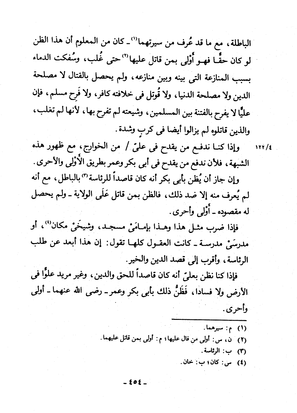 وَإِنْ جَازَ أَنْ يُظَنَّ بِأَبِي بَكْرٍ أَنَّهُ كَانَ قَاصِدًا لِلرِّئَاسَةِ (¬3) بِالْبَاطِلِ مَعَ أَنَّهُ لَمْ يُعْرَفْ مِنْهُ إِلَّا ضِدُّ ذَلِكَ، فَالظَّنُّ بِمَنْ قَاتَلَ عَلَى الْوِلَايَةِ - وَلَمْ يَحْصُلْ لَهُ مَقْصُودُهُ - أَوْلَى وَأَحْرَى.