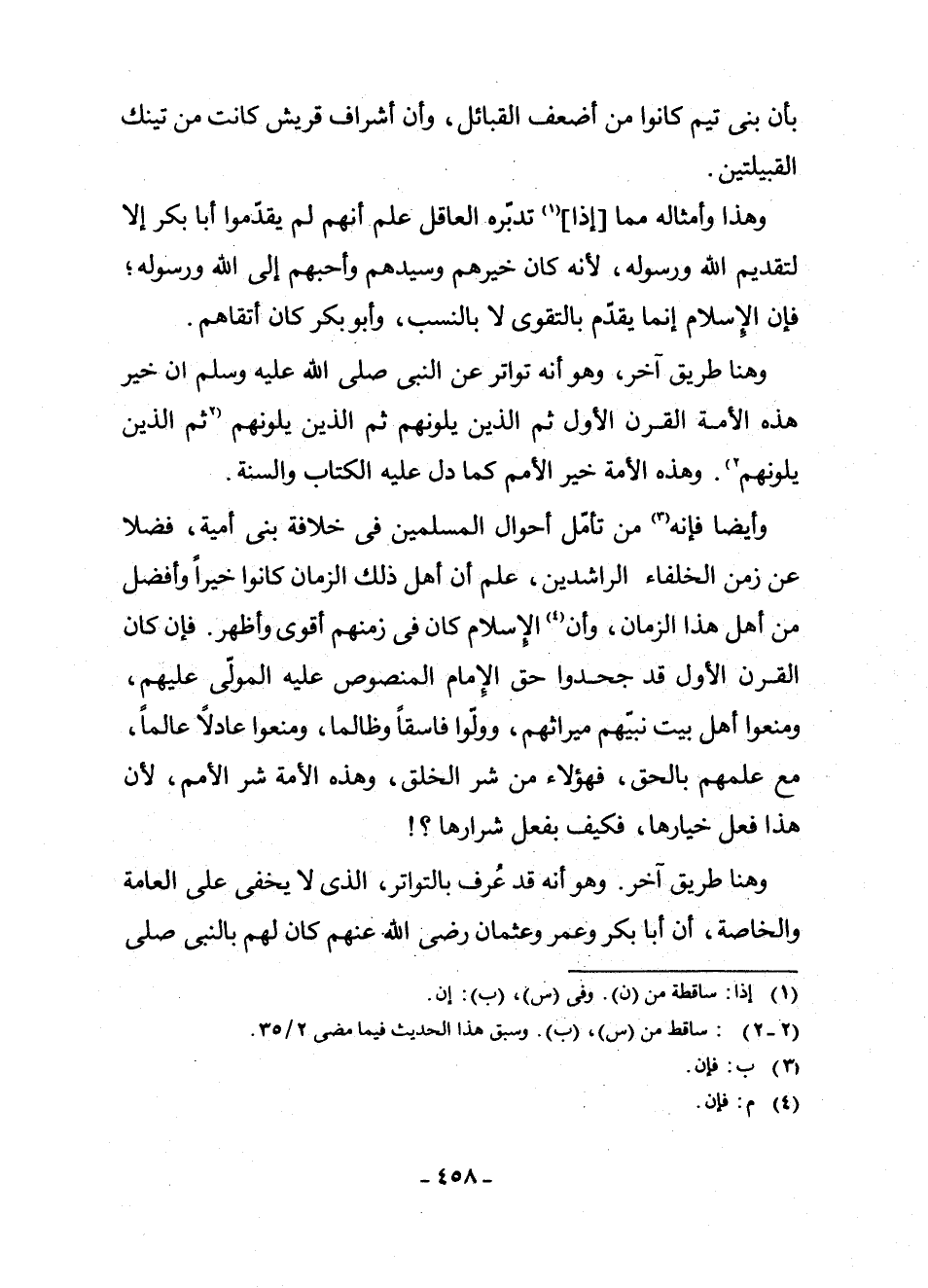 وَأَيْضًا فَإِنَّهُ (¬4) مَنْ تَأَمَّلَ أَحْوَالَ الْمُسْلِمِينَ فِي خِلَافَةِ بَنِي أُمَيَّةَ، فَضْلًا عَنْ زَمَنِ الْخُلَفَاءِ الرَّاشِدِينَ، عَلِمَ أَنَّ أَهْلَ ذَلِكَ الزَّمَانِ كَانُوا خَيْرًا وَأَفْضَلَ مِنْ أَهْلِ هَذَا الزَّمَانِ، وَأَنَّ (¬5) الْإِسْلَامَ كَانَ فِي زَمَنِهِمْ أَقْوَى وَأَظْهَرَ، فَإِنْ كَانَ الْقَرْنُ الْأَوَّلُ قَدْ جَحَدُوا حَقَّ الْإِمَامِ الْمَنْصُوصِ عَلَيْهِ الْمُوَلَّى عَلَيْهِمْ، وَمَنَعُوا أَهْلَ بَيْتِ نَبِيِّهِمْ مِيرَاثَهُمْ، وَوَلَّوْا فَاسِقًا وَظَالِمًا، وَمَنَعُوا عَادِلًا عَالِمًا، مَعَ عِلْمِهِمْ بِالْحَقِّ، فَهَؤُلَاءِ مِنْ شَرِّ الْخَلْقِ، وَهَذِهِ الْأُمَّةُ شَرُّ الْأُمَمِ ; لِأَنَّ هَذَا فِعْلُ خِيَارِهَا، فَكَيْفَ بِفِعْلِ شِرَارِهَا؟ ! .