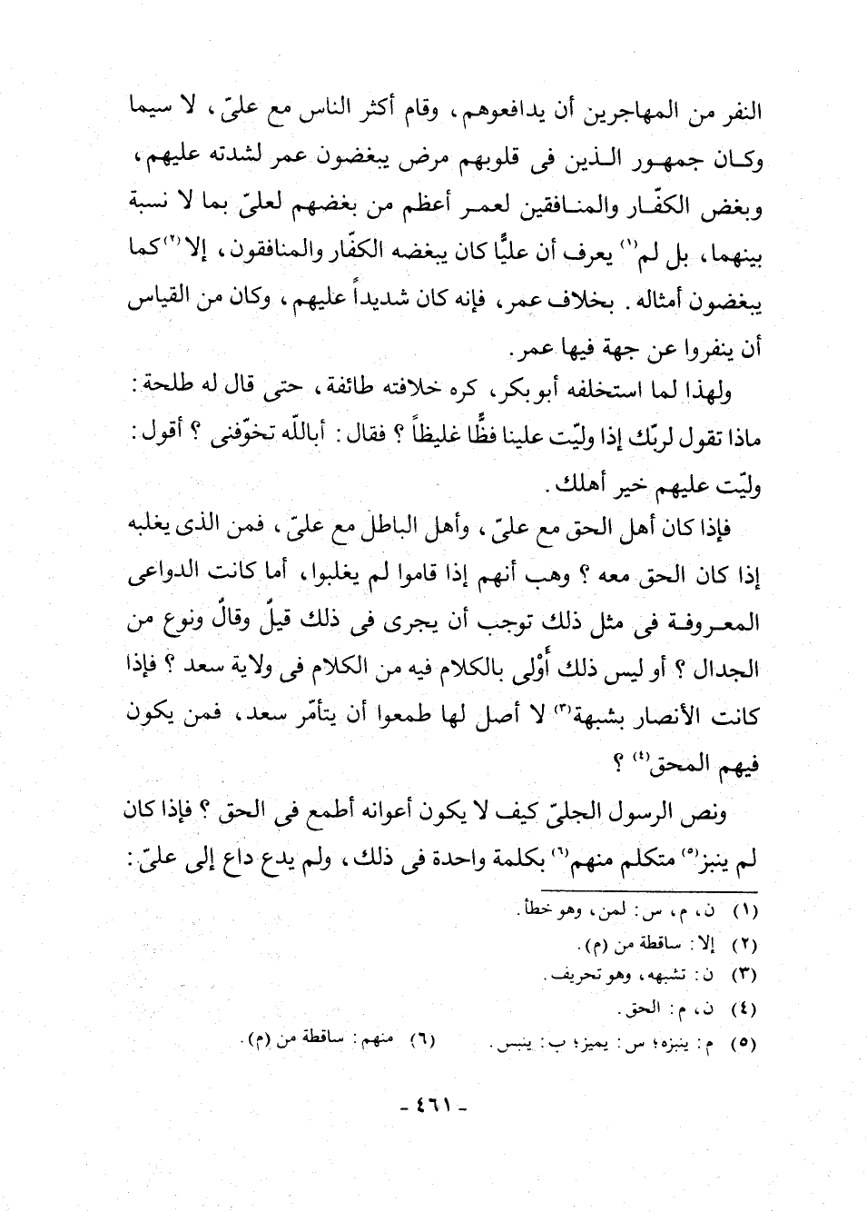 فَإِذَا كَانَ أَهْلُ الْحَقِّ مَعَ عَلِيٍّ، وَأَهْلُ الْبَاطِلِ مَعَ عَلِيٍّ، فَمَنِ الَّذِي يَغْلِبُهُ إِذَا كَانَ الْحَقُّ مَعَهُ؟ وَهَبْ أَنَّهُمْ إِذَا قَامُوا لَمْ يَغْلِبُوا، أَمَا كَانَتِ الدَّوَاعِي الْمَعْرُوفَةُ فِي مِثْلِ ذَلِكَ تُوجِبُ أَنْ يَجْرِيَ فِي ذَلِكَ قِيلَ وَقَالَ وَنَوْعٌ مِنَ الْجِدَالِ؟ أَوَلَيْسَ ذَلِكَ أَوْلَى بِالْكَلَامِ فِيهِ مِنَ الْكَلَامِ فِي وِلَايَةِ سَعْدٍ؟ فَإِذَا كَانَتِ الْأَنْصَارُ بِشُبْهَةٍ (¬3) لَا أَصْلَ لَهَا طَمِعُوا أَنْ يَتَأَمَّرَ سَعْدٌ، فَمَنْ يَكُونُ فِيهِمُ الْمُحِقُّ (¬4) ؟