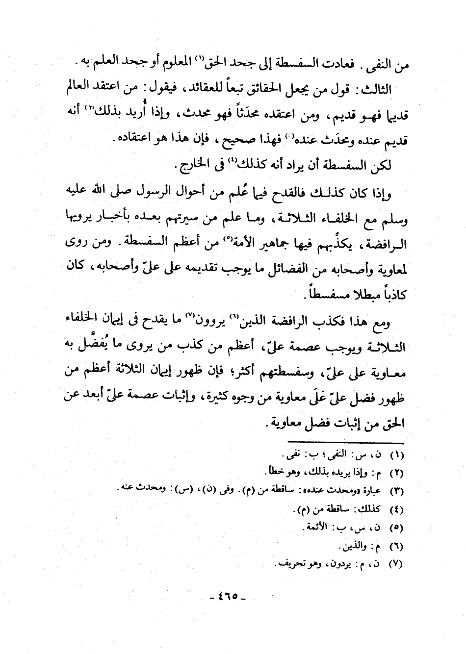 وَإِذَا كَانَ كَذَلِكَ فَالْقَدْحُ فِيمَا عُلِمَ مِنْ أَحْوَالِ الرَّسُولِ صَلَّى اللَّهُ عَلَيْهِ وَسَلَّمَ مَعَ الْخُلَفَاءِ الثَّلَاثَةِ، وَمَا عُلِمَ مِنْ سِيرَتِهِمْ بَعْدَهُ بِأَخْبَارٍ يَرْوِيهَا الرَّافِضَةُ يُكَذِّبُهُمْ فِيهَا جَمَاهِيرُ الْأُمَّةِ (¬5) مِنْ أَعْظَمِ السَّفْسَطَةِ، وَمَنْ رَوَى لِمُعَاوِيَةَ وَأَصْحَابِهِ مِنَ الْفَضَائِلِ مَا يُوجِبُ تَقْدِيمَهُ عَلَى عَلِيٍّ وَأَصْحَابِهِ كَانَ كَاذِبًا مُبْطِلًا مُسَفْسِطًا.