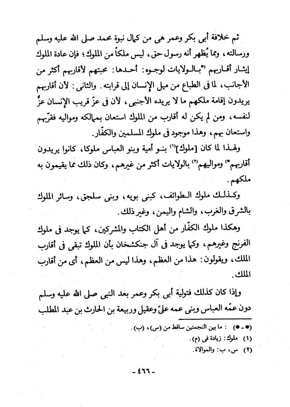 ثُمَّ خِلَافَةُ أَبِي بَكْرٍ وَعُمَرَ هِيَ مِنْ كَمَالِ نُبُوَّةِ مُحَمَّدٍ صَلَّى اللَّهُ عَلَيْهِ وَسَلَّمَ وَرِسَالَتِهِ، وَمِمَّا يُظْهِرُ أَنَّهُ رَسُولٌ حَقٌّ، لَيْسَ مَلِكًا مِنَ الْمُلُوكِ، فَإِنَّ عَادَةَ الْمُلُوكِ إِيثَارُ أَقَارِبِهِمْ * بِالْوِلَايَاتِ لِوُجُوهٍ: أَحَدُهَا: مَحَبَّتُهُمْ لِأَقَارِبِهِمْ أَكْثَرُ مِنَ الْأَجَانِبِ، لِمَا فِي الطِّبَاعِ مِنْ مَيْلِ الْإِنْسَانِ إِلَى قَرَابَتِهِ، وَالثَّانِي: لِأَنَّ أَقَارِبَهُمْ يُرِيدُونَ إِقَامَةَ مُلْكِهِمْ مَا لَا يُرِيدُهُ الْأَجْنَبِيُّ ; لِأَنَّ فِي عِزِّ قَرِيبِ الْإِنْسَانِ عِزًّا لِنَفْسِهِ، وَمَنْ لَمْ يَكُنْ لَهُ أَقَارِبُ مِنَ الْمُلُوكِ اسْتَعَانَ بِمَمَالِكِهِ وَمَوَالِيهِ فَقَرَّبَهُمْ وَاسْتَعَانَ بِهِمْ، وَهَذَا مَوْجُودٌ فِي مُلُوكِ الْمُسْلِمِينَ وَالْكُفَّارِ.
