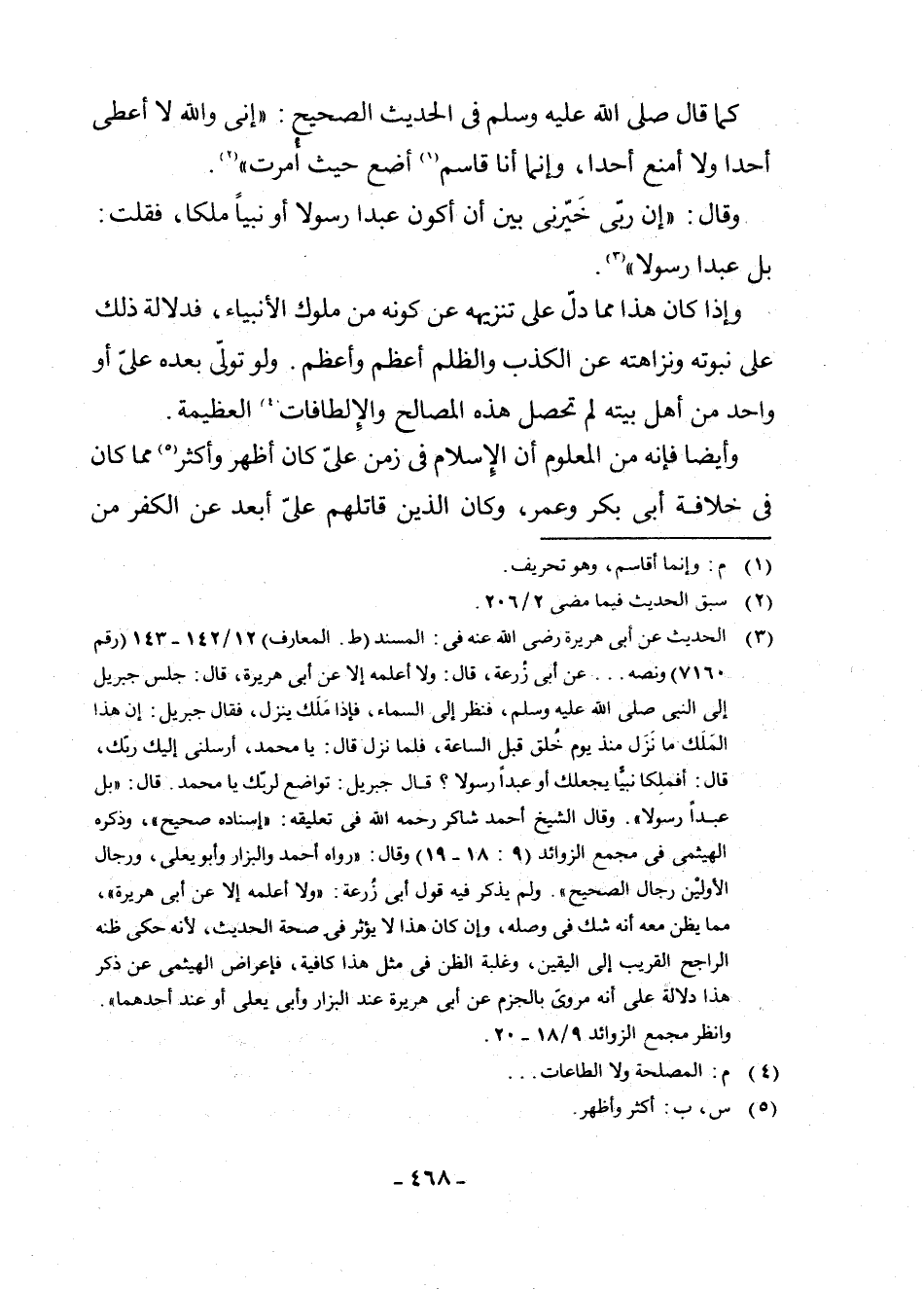 (¬3) الْحَدِيثُ عَنْ أَبِي هُرَيْرَةَ رَضِيَ اللَّهُ عَنْهُ فِي: الْمُسْنَدِ (ط. الْمَعَارِفِ) 12/142 143 (رَقْمُ 7160) وَنَصُّهُ. . . عَنْ أَبِي زُرْعَةَ، قَالَ: وَلَا أَعْلَمُهُ إِلَّا عَنْ أَبِي هُرَيْرَةَ، قَالَ: جَلَسَ جِبْرِيلُ إِلَى النَّبِيِّ صَلَّى اللَّهُ عَلَيْهِ وَسَلَّمَ، فَنَظَرَ إِلَى السَّمَاءِ، فَإِذَا مَلَكٌ يَنْزِلُ، فَقَالَ جِبْرِيلُ: إِنَّ هَذَا الْمَلَكَ مَا نَزَلَ مُنْذُ يَوْمِ خُلِقَ قَبْلَ السَّاعَةِ، فَلَمَّا نَزَلَ قَالَ: يَا مُحَمَّدُ، أَرْسَلَنِي إِلَيْكَ رَبُّكَ، قَالَ: أَفَمَلِكًا نَبِيًّا يَجْعَلُكَ أَوْ عَبْدًا رَسُولًا؟ قَالَ جِبْرِيلُ: تَوَاضَعْ لِرَبِّكَ يَا مُحَمَّدُ. قَالَ: " بَلْ عَبْدًا رَسُولًا ". قَالَ الشَّيْخُ أَحْمَد شَاكِر رَحِمَهُ اللَّهُ فِي تَعْلِيقِهِ: " إِسْنَادُهُ صَحِيحٌ "، وَذَكَرَهُ الْهَيْثَمِيُّ فِي مَجْمَعِ " الزَّوَائِدِ (9: 18/19) وَقَالَ: " رَوَاهُ أَحْمَدُ وَالْبَزَّارُ، وَأَبُو يَعْلَى، وَرِجَالُ الْأَوَّلِينَ رِجَالُ الصَّحِيحِ ". وَلَمْ يَذْكُرْ فِيهِ قَوْلَ أَبِي زُرْعَةَ: " وَلَا أَعْلَمُهُ إِلَّا عَنْ أَبِي هُرَيْرَةَ "، مِمَّا يُظَنُّ مَعَهُ أَنَّهُ شَكَّ فِي وَصْلِهِ، وَإِنْ كَانَ هَذَا لَا يُؤَثِّرُ فِي صِحَّةِ الْحَدِيثِ، لِأَنَّهُ حَكَى ظَنَّهُ الرَّاجِحَ الْقَرِيبَ إِلَى الْيَقِينِ، وَغَلَبَةُ الظَّنِّ فِي مِثْلِ هَذَا كَافِيَةٌ، فَإِعْرَاضُ الْهَيْثَمِيِّ عَنْ ذِكْرِ هَذَا دَلَالَةٌ عَلَى أَنَّهُ مَرْوِيٌّ بِالْجَزْمِ عَنْ أَبِي هُرَيْرَةَ عِنْدَ الْبَزَّارِ وَأَبِي يَعْلَى أَوْ عِنْدَ أَحَدِهِمَا ". وَانْظُرْ مَجْمَعَ الزَّوَائِدِ 9/18 \ 20