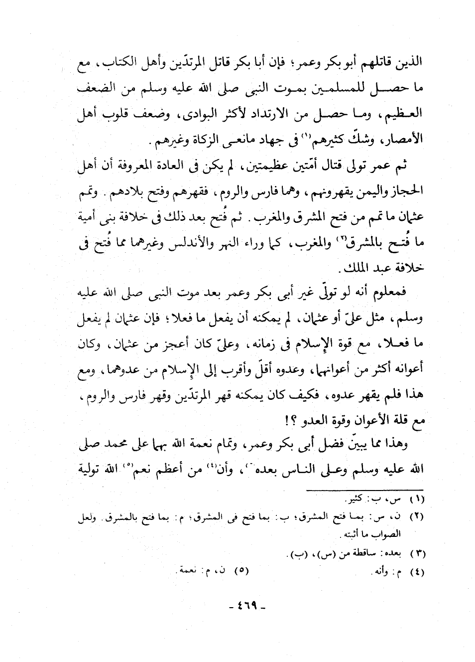فَمَعْلُومٌ أَنَّهُ لَوْ تَوَلَّى غَيْرُ أَبِي بَكْرٍ وَعُمَرَ بَعْدَ مَوْتِ النَّبِيِّ صَلَّى اللَّهُ عَلَيْهِ وَسَلَّمَ، مِثْلُ عَلِيٍّ أَوْ عُثْمَانَ، لَمْ يُمْكِنْهُ أَنْ يَفْعَلَ مَا فَعَلَا، فَإِنَّ عُثْمَانَ لَمْ يَفْعَلْ مَا فَعَلَا مَعَ قُوَّةِ الْإِسْلَامِ فِي زَمَانِهِ، وَعَلِيٌّ كَانَ أَعْجَزَ مِنْ عُثْمَانَ، وَكَانَ أَعْوَانُهُ أَكْثَرَ مِنْ أَعْوَانِهِمَا، وَعَدُوُّهُ أَقَلَّ وَأَقْرَبَ إِلَى الْإِسْلَامِ مِنْ عَدُوِّهِمَا، وَمَعَ هَذَا فَلَمْ يَقْهَرْ عَدُوَّهُ، فَكَيْفَ كَانَ يُمْكِنُهُ قَهْرُ الْمُرْتَدِّينَ، وَقَهْرُ فَارِسَ وَالرُّومَ مَعَ قِلَّةِ الْأَعْوَانِ، وَقُوَّةِ الْعَدُوِّ.