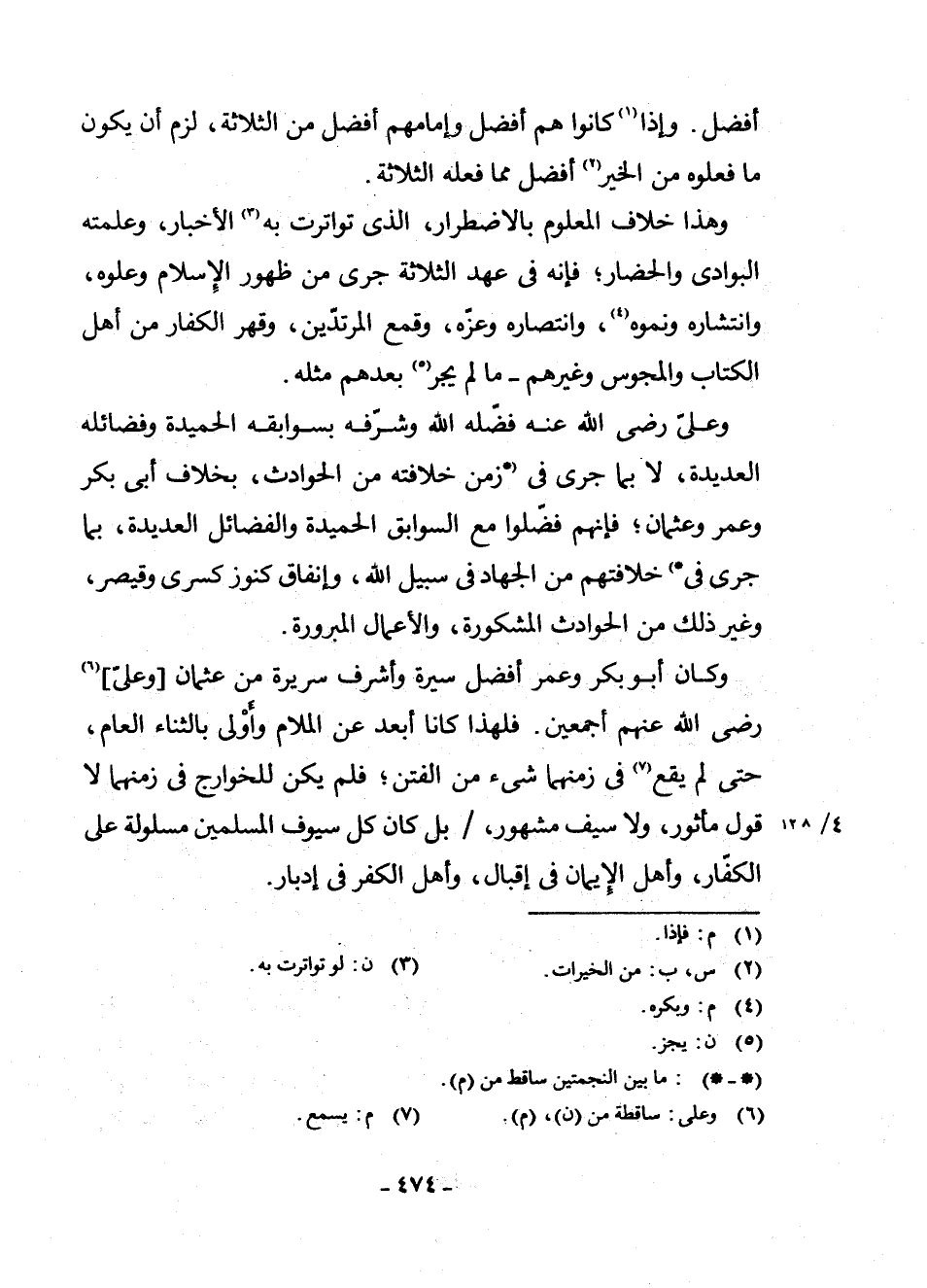 وَكَانَ أَبُو بَكْرٍ وَعُمَرُ أَفْضَلَ سِيرَةً وَأَشْرَفَ سَرِيرَةً مِنْ (عُثْمَانَ) وَعَلِيٍّ (¬7) رَضِيَ اللَّهُ عَنْهُمْ أَجْمَعِينَ فَلِهَذَا كَانَا أَبْعَدَ عَنِ الْمَلَامِ، وَأَوْلَى بِالثَّنَاءِ الْعَامِّ حَتَّى لَمْ يَقَعْ (¬8) فِي زَمَنِهِمَا شَيْءٌ مِنَ الْفِتَنِ، فَلَمْ يَكُنْ لِلْخَوَارِجِ فِي زَمَنِهِمَا لَا قَوْلٌ مَأْثُورٌ، وَلَا سَيْفٌ مَشْهُورٌ، بَلْ كَانَ كُلُّ سُيُوفِ الْمُسْلِمِينَ مَسْلُولَةً عَلَى الْكُفَّارِ، وَأَهْلُ الْإِيمَانِ فِي إِقْبَالٍ، وَأَهْلُ الْكُفْرِ فِي إِدْبَارٍ.